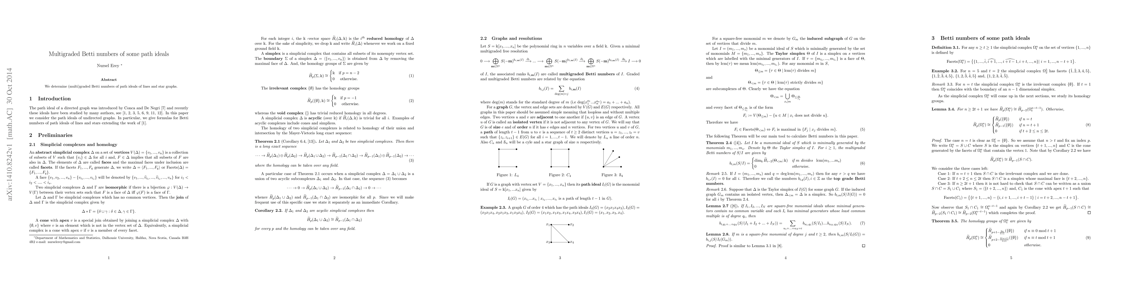 Summary: This paper calculates the multigraded Betti numbers for path ideals derived from lines and star graphs, providing insight into their algebraic structure. The findings highlight the complexity and characteristics of these ideals in algebraic graph theory.