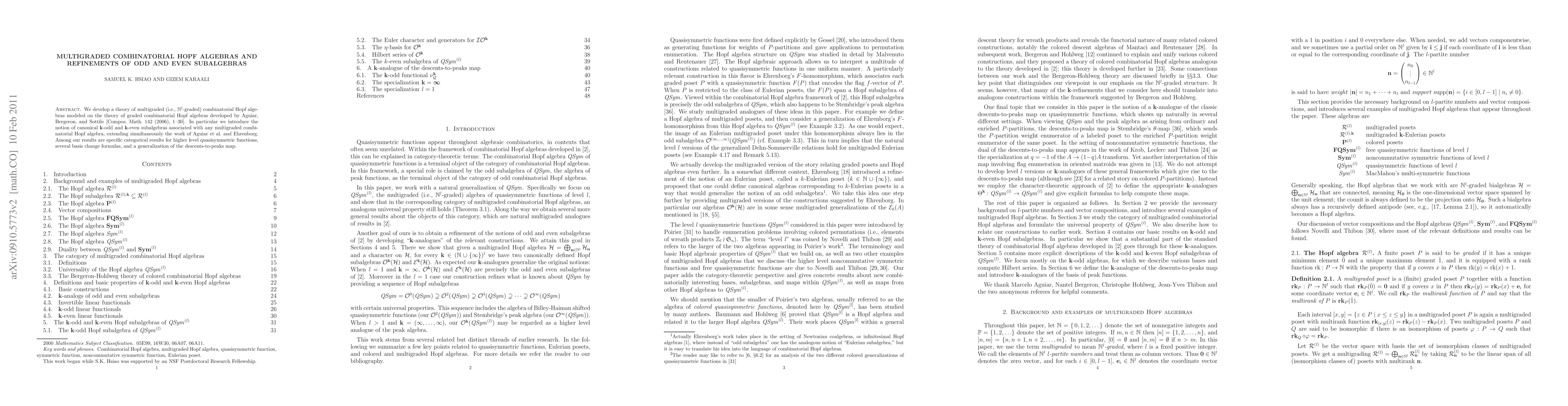 We develop a theory of multigraded (i.e., $N^l$-graded) combinatorial Hopf algebras modeled on the theory of graded combinatorial Hopf algebras developed by Aguiar, Bergeron, and Sottile [Compos. Math. 142 (2006), 1--30]. In particular we introduce the notion of canonical $k$-odd and $k$-even subalgebras associated with any multigraded combinatorial Hopf algebra, extending simultaneously the work of Aguiar et al. and Ehrenborg. Among our results are specific categorical results for higher level quasisymmetric functions, several basis change formulas, and a generalization of the descents-to-peaks map.
