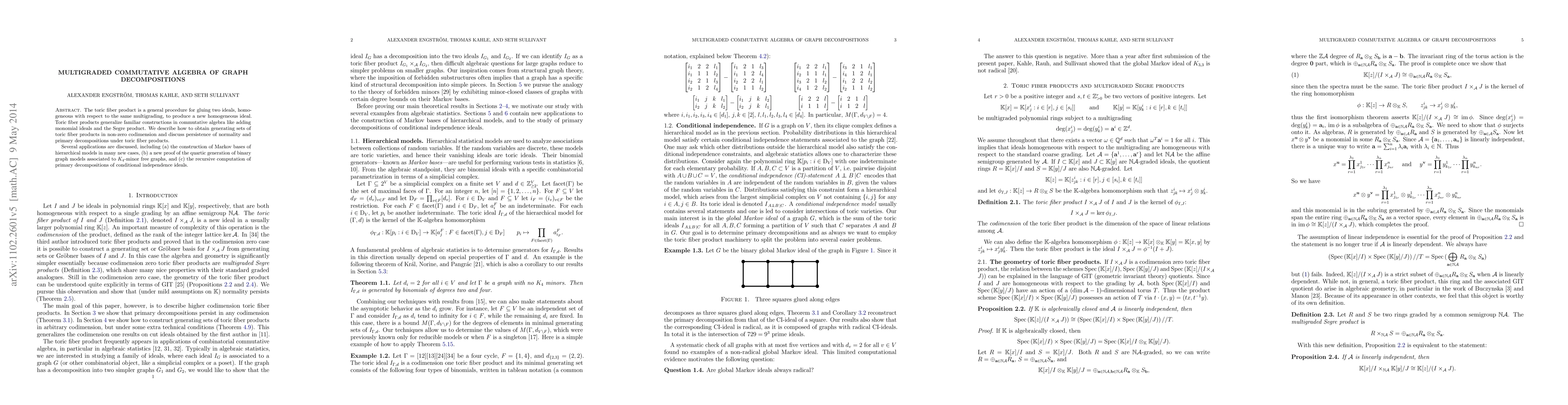 This paper explores the toric fiber product, a method for combining homogeneous ideals under multigrading, extending familiar commutative algebra techniques. It discusses generating sets, normality, and primary decompositions in this context, with applications to Markov bases, quartic generation in binary graph models, and recursive computation of primary decompositions.