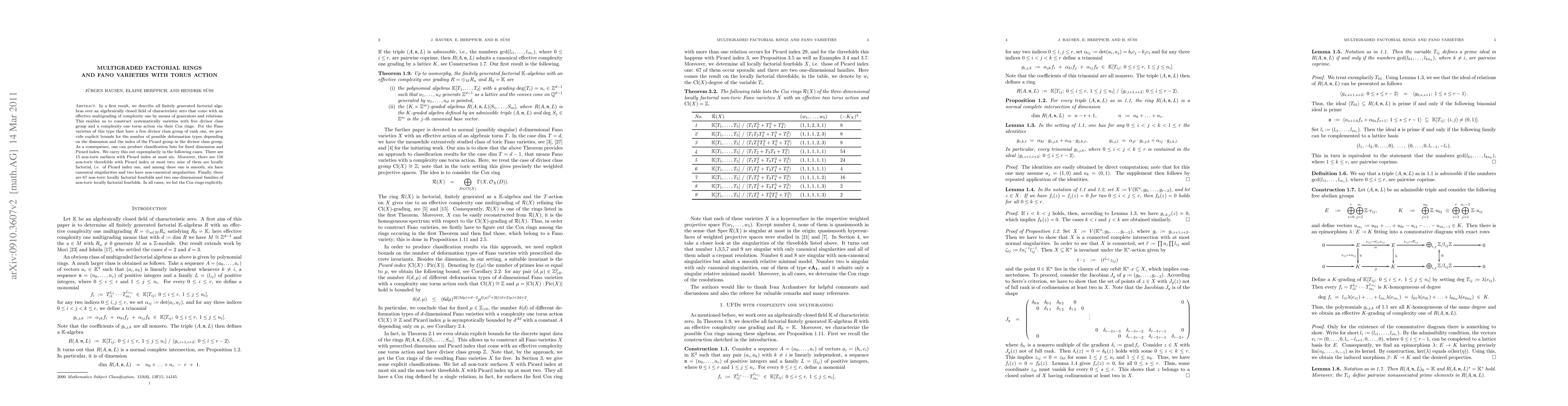 This paper classifies finitely generated factorial algebras with complexity one multigrading and constructs Fano varieties with torus action via their Cox rings. It provides explicit bounds for the number of deformation types for Fano varieties with rank one free divisor class group, leading to classification lists for specific dimensions and Picard indices.
