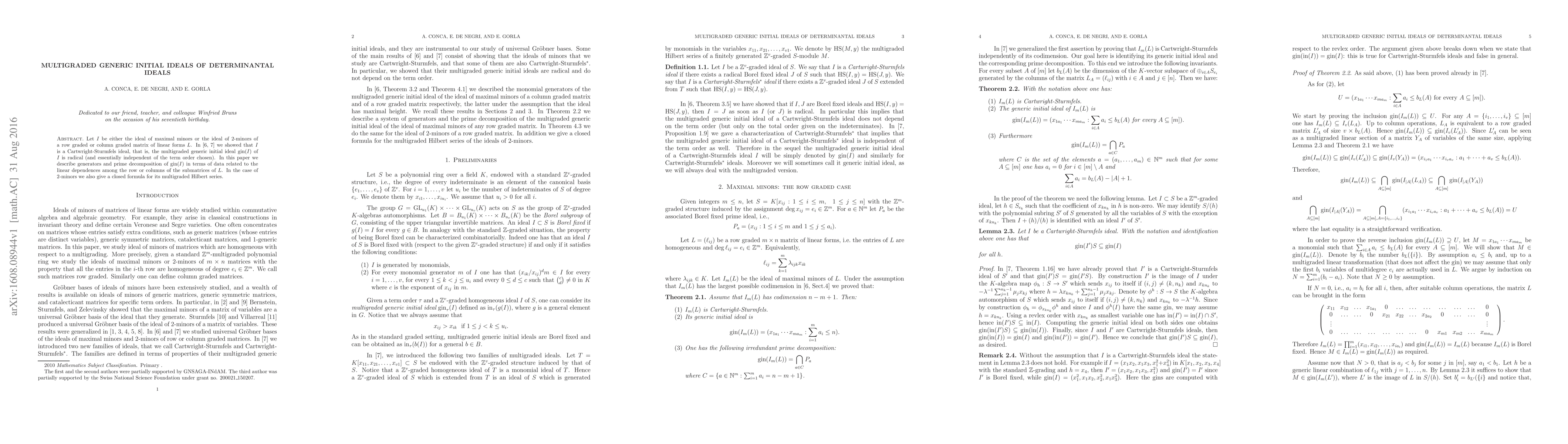 This paper investigates the multigraded generic initial ideal gin(I) of determinantal ideals generated by maximal or 2-minors of row or column graded matrices. It provides generators and prime decomposition of gin(I) based on linear dependencies among matrix submatrices, and a closed formula for the Hilbert series in the case of 2-minors.