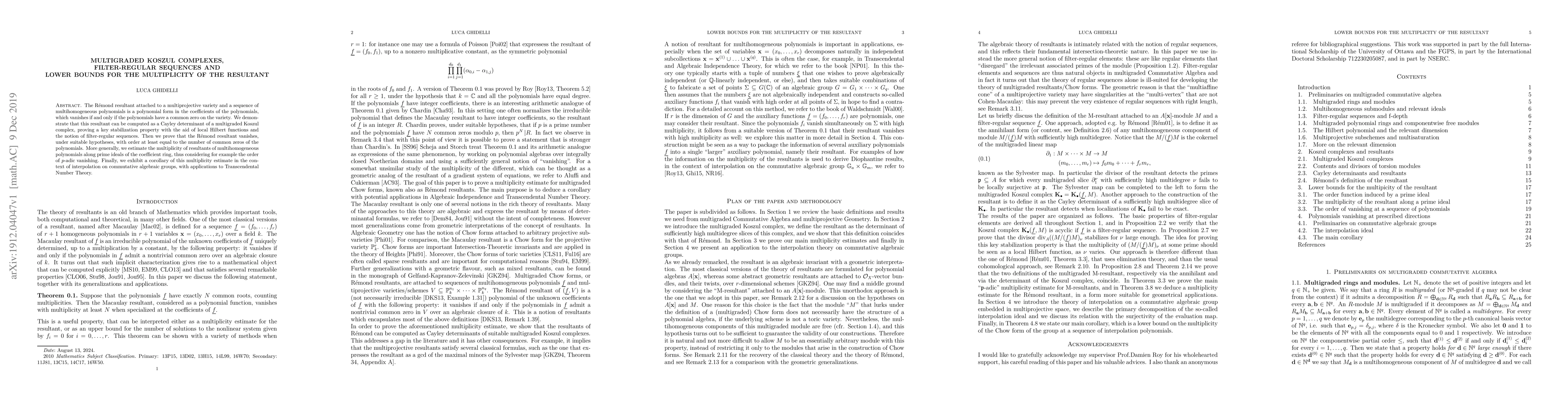 The R\'emond resultant attached to a multiprojective variety and a sequence of multihomogeneous polynomials is a polynomial form in the coefficients of the polynomials, which vanishes if and only if the polynomials have a common zero on the variety. We demonstrate that this resultant can be computed as a Cayley determinant of a multigraded Koszul complex, proving a key stabilization property with the aid of local Hilbert functions and the notion of filter-regular sequences. Then we prove that the R\'emond resultant vanishes, under suitable hypotheses, with order at least equal to the number of common zeros of the polynomials. More generally, we estimate the multiplicity of resultants of multihomogeneous polynomials along prime ideals of the coefficient ring, thus considering for example the order of $p$-adic vanishing. Finally, we exhibit a corollary of this multiplicity estimate in the context of interpolation on commutative algebraic groups, with applications to Transcendental Number Theory.