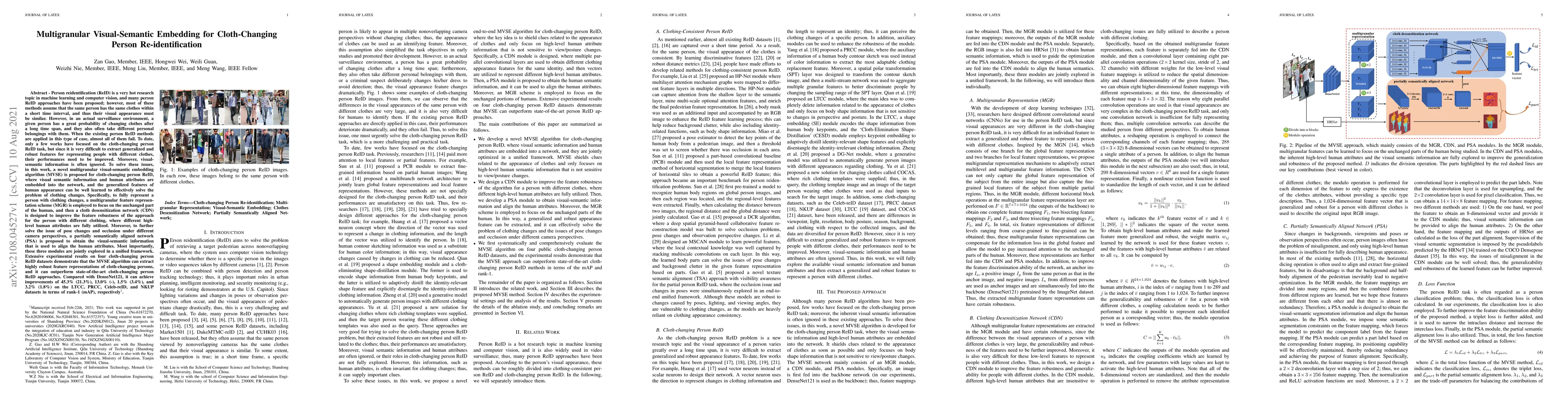 Person reidentification (ReID) is a very hot research topic in machine learning and computer vision, and many person ReID approaches have been proposed; however, most of these methods assume that the same person has the same clothes within a short time interval, and thus their visual appearance must be similar. However, in an actual surveillance environment, a given person has a great probability of changing clothes after a long time span, and they also often take different personal belongings with them. When the existing person ReID methods are applied in this type of case, almost all of them fail. To date, only a few works have focused on the cloth-changing person ReID task, but since it is very difficult to extract generalized and robust features for representing people with different clothes, their performances need to be improved. Moreover, visual-semantic information is often ignored. To solve these issues, in this work, a novel multigranular visual-semantic embedding algorithm (MVSE) is proposed for cloth-changing person ReID, where visual semantic information and human attributes are embedded into the network, and the generalized features of human appearance can be well learned to effectively solve the problem of clothing changes. Specifically, to fully represent a person with clothing changes, a multigranular feature representation scheme (MGR) is employed to focus on the unchanged part of the human, and then a cloth desensitization network (CDN) is designed to improve the feature robustness of the approach for the person with different clothing, where different high-level human attributes are fully utilized. Moreover, to further solve the issue of pose changes and occlusion under different camera perspectives, a partially semantically aligned network (PSA) is proposed to obtain the visual-semantic information that is used to align the human attributes.