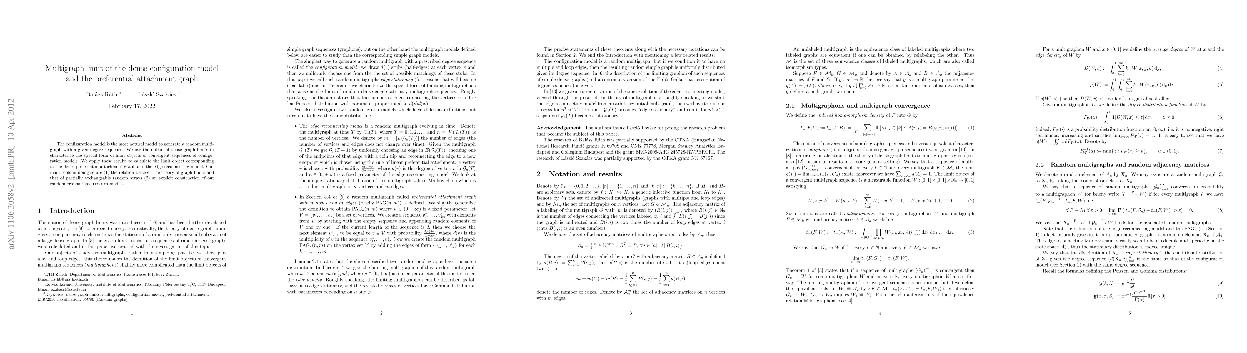 This paper characterizes the limit objects of convergent sequences of dense configuration models using graph limits and partially exchangeable random arrays. It applies these methods to determine the limit of dense preferential attachment graphs and edge reconnecting models, utilizing urn models for explicit construction.
