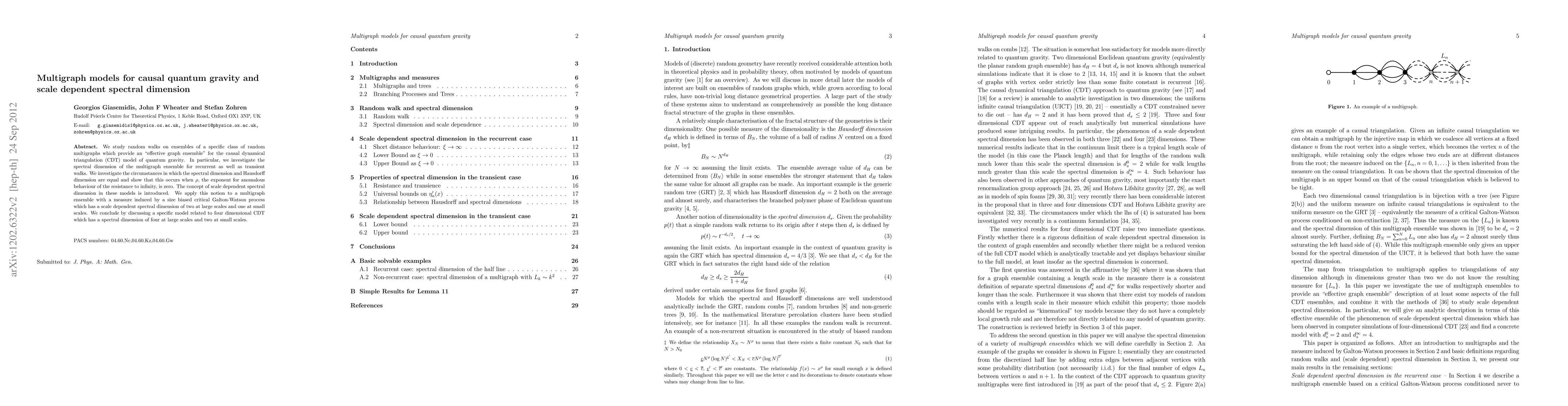 This paper explores random walks on multigraph ensembles that model causal quantum gravity, focusing on the causal dynamical triangulation (CDT) model. It investigates the spectral dimension's scale dependence and finds that it equals the Hausdorff dimension when the resistance exponent is zero.