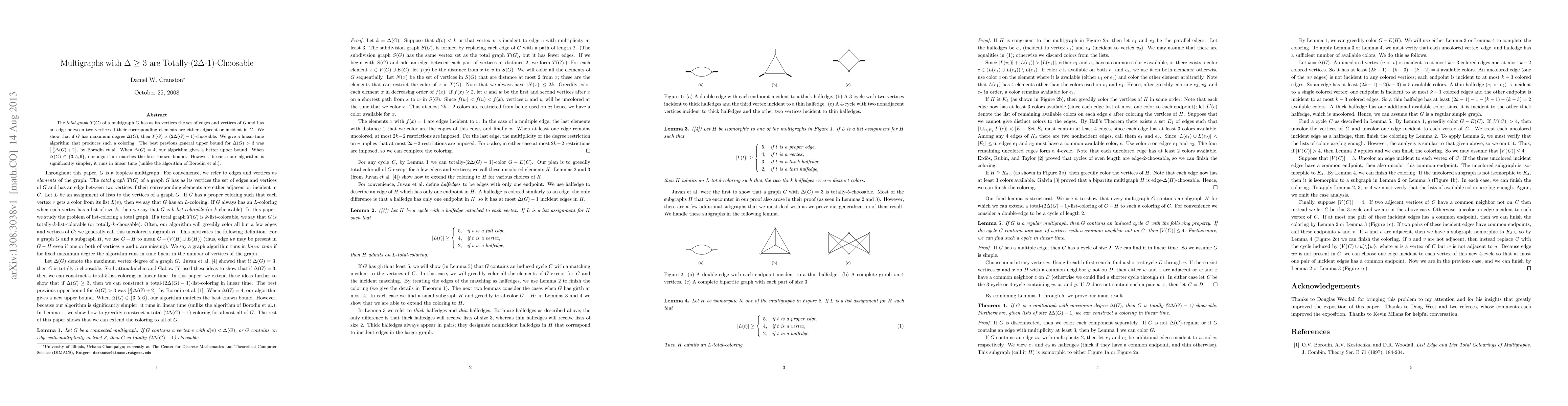 This paper demonstrates that multigraphs with a maximum degree of $\Delta \ge 3$ have their total graphs $T(G)$ as $(2\Delta-1)$-choosable. It presents a linear-time algorithm to achieve this coloring, improving upon the previous best bound for $\Delta > 3$.