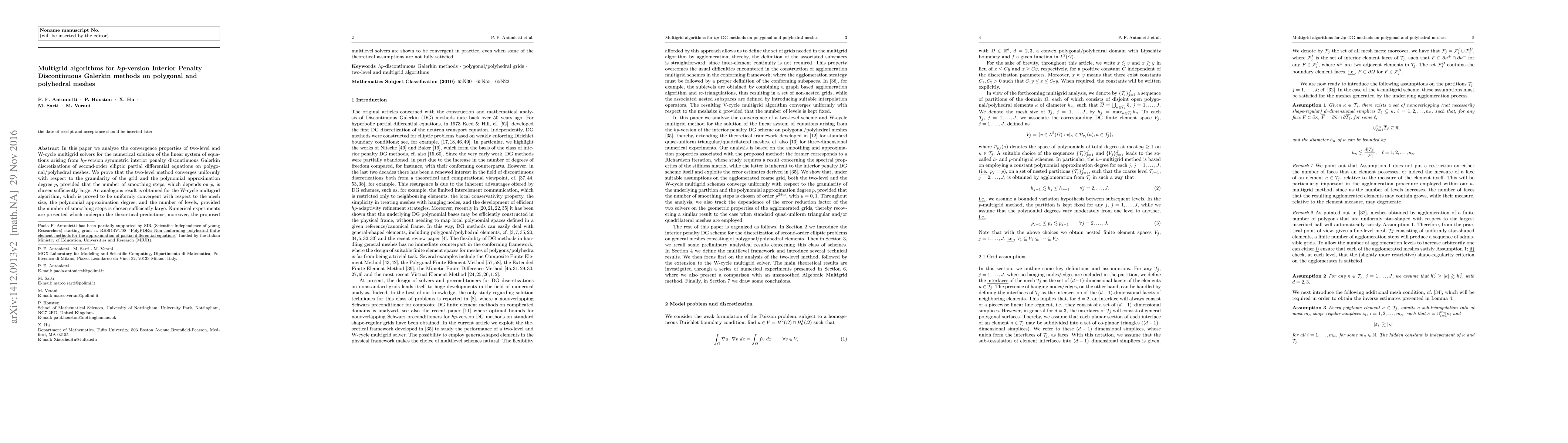 This paper analyzes the convergence of two-level and W-cycle multigrid solvers for hp-version interior penalty discontinuous Galerkin methods on polygonal/polyhedral meshes. It proves uniform convergence for both methods with sufficient smoothing steps, and numerical experiments support the theoretical findings.