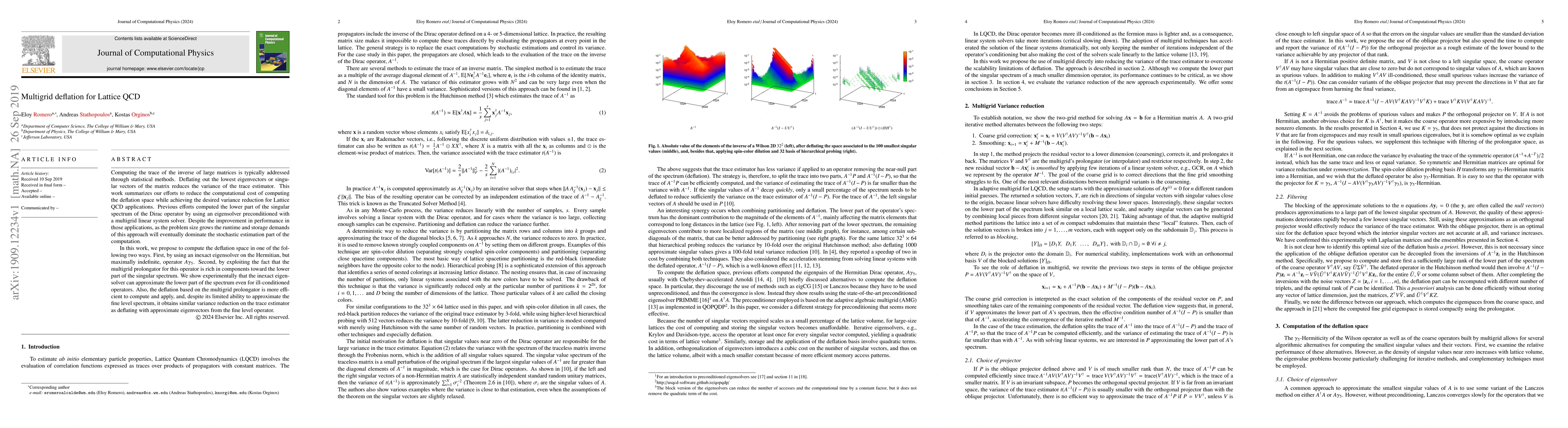 Computing the trace of the inverse of large matrices is typically addressed through statistical methods. Deflating out the lowest eigenvectors or singular vectors of the matrix reduces the variance of the trace estimator. This work summarizes our efforts to reduce the computational cost of computing the deflation space while achieving the desired variance reduction for Lattice QCD applications. Previous efforts computed the lower part of the singular spectrum of the Dirac operator by using an eigensolver preconditioned with a multigrid linear system solver. Despite the improvement in performance in those applications, as the problem size grows the runtime and storage demands of this approach will eventually dominate the stochastic estimation part of the computation. In this work, we propose to compute the deflation space in one of the following two ways. First, by using an inexact eigensolver on the Hermitian, but maximally indefinite, operator $A \gamma_5$. Second, by exploiting the fact that the multigrid prolongator for this operator is rich in components toward the lower part of the singular spectrum. We show experimentally that the inexact eigensolver can approximate the lower part of the spectrum even for ill-conditioned operators. Also, the deflation based on the multigrid prolongator is more efficient to compute and apply, and, despite its limited ability to approximate the fine level spectrum, it obtains similar variance reduction on the trace estimator as deflating with approximate eigenvectors from the fine level operator.