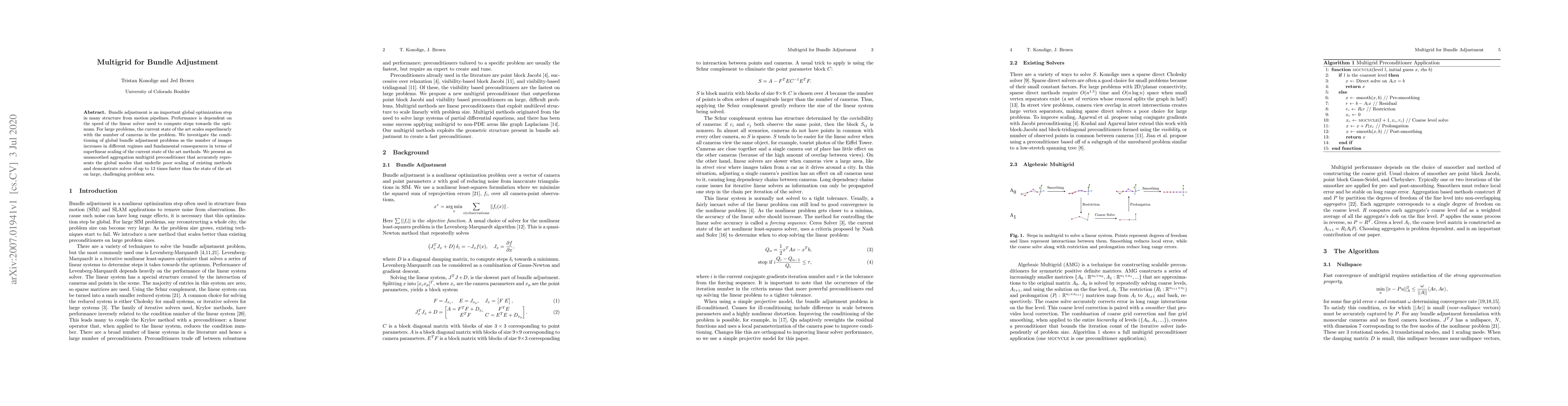 This paper proposes an unsmoothed aggregation multigrid preconditioner to improve bundle adjustment performance, addressing the superlinear scaling issue of current methods. The new approach achieves up to 13 times faster solves on large datasets compared to state-of-the-art techniques.