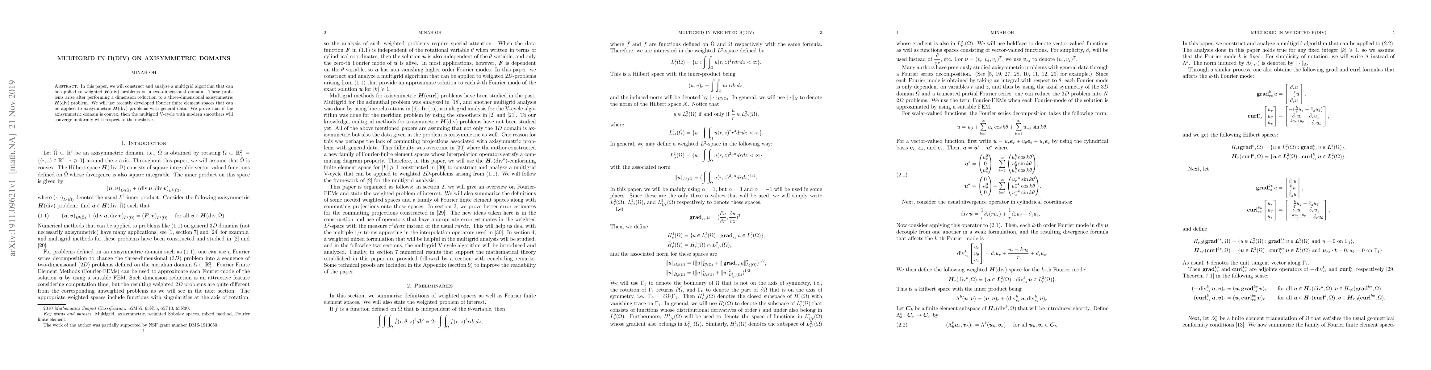 This paper constructs and analyzes a multigrid algorithm for solving weighted H(div)-problems on two-dimensional axisymmetric domains, derived from three-dimensional problems. It demonstrates uniform convergence of the multigrid V-cycle with modern smoothers for convex axisymmetric domains.