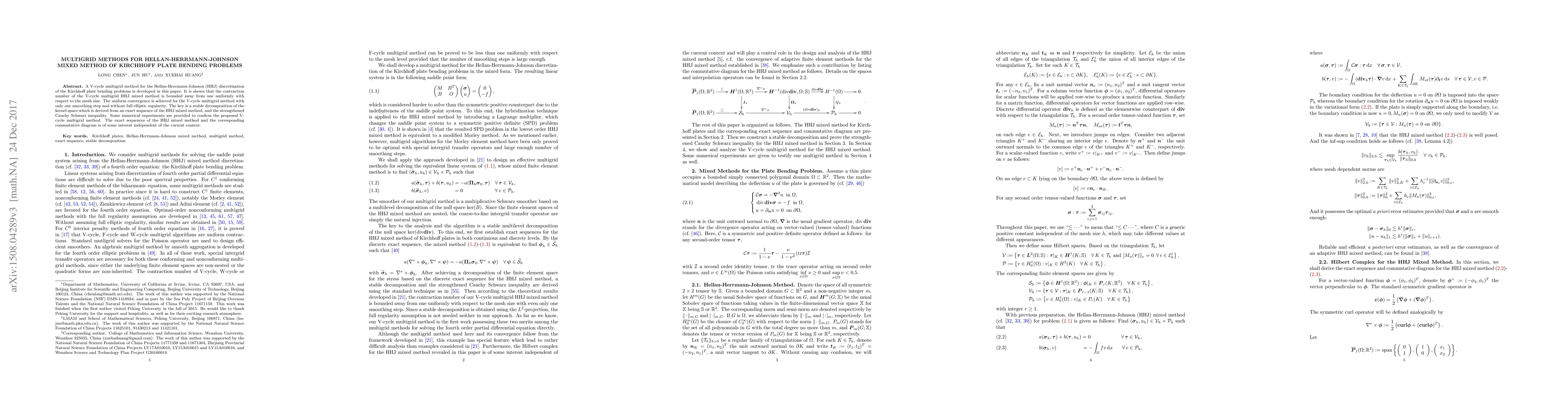This paper develops a V-cycle multigrid method for the Hellan-Herrmann-Johnson (HHJ) discretization of Kirchhoff plate bending problems, demonstrating uniform convergence with a bounded contraction number. The method achieves this through a stable decomposition of the kernel space and a strengthened Cauchy-Schwarz inequality.