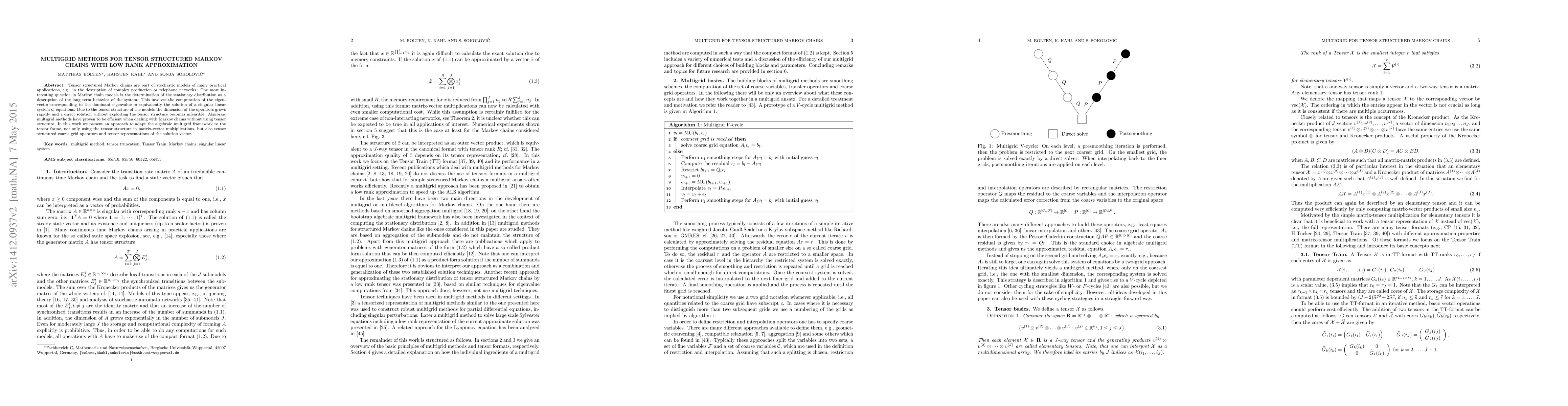 This paper proposes an adaptation of algebraic multigrid methods to tensor structured Markov chains, utilizing low rank approximations to manage the rapidly growing dimensions. The approach leverages tensor structure in matrix-vector multiplications and coarse-grid operators to efficiently compute the stationary distribution.