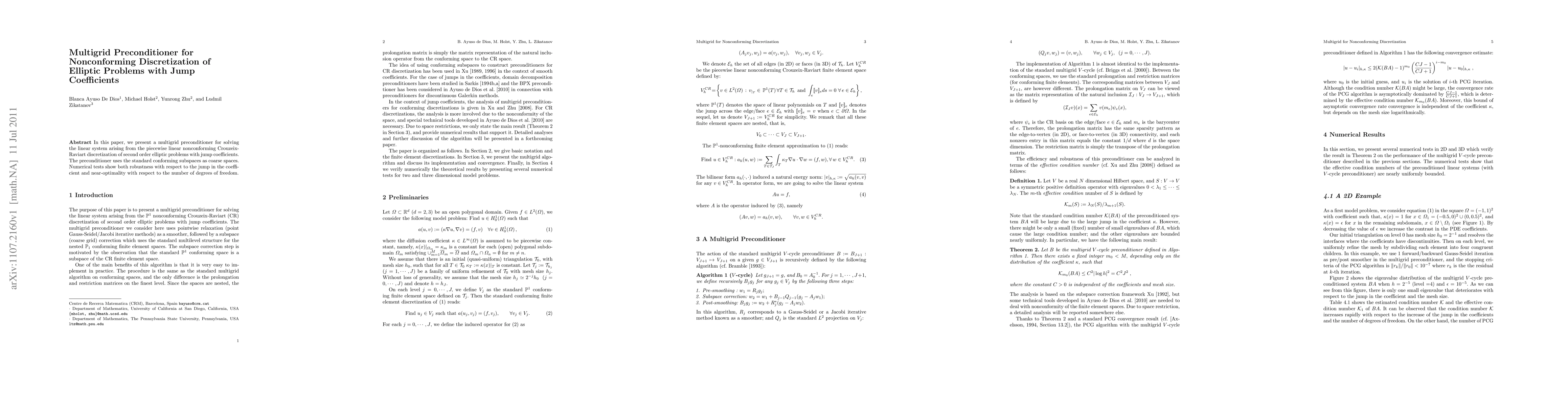 This paper introduces a multigrid preconditioner for nonconforming Crouzeix-Raviart discretization of elliptic problems featuring jump coefficients. The proposed method employs conforming subspaces as coarse spaces, demonstrating robustness and near-optimal performance with respect to the number of degrees of freedom.