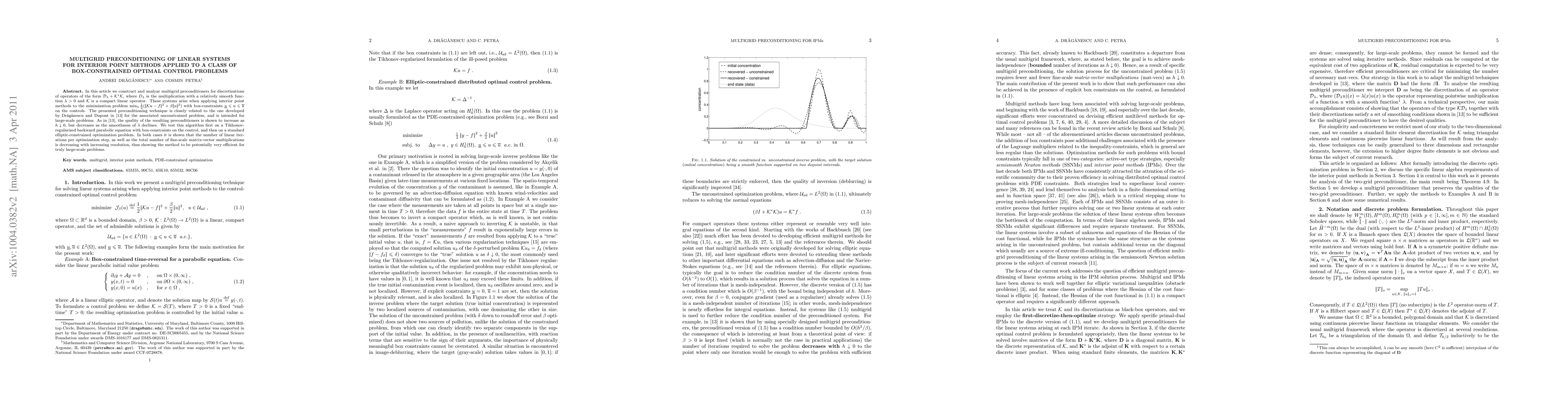 In this article we construct and analyze multigrid preconditioners for discretizations of operators of the form D+K* K, where D is the multiplication with a relatively smooth positive function and K is a compact linear operator. These systems arise when applying interior point methods to the minimization problem min_u (||K u-f||^2 +b||u||^2) with box-constraints on the controls u. The presented preconditioning technique is closely related to the one developed by Draganescu and Dupont in [11] for the associated unconstrained problem, and is intended for large-scale problems. As in [11], the quality of the resulting preconditioners is shown to increase with increasing resolution but decreases as the diagonal of D becomes less smooth. We test this algorithm first on a Tikhonov-regularized backward parabolic equation with box-constraints on the control, and then on a standard elliptic-constrained optimization problem. In both cases it is shown that the number of linear iterations per optimization step, as well as the total number of fine-scale matrix-vector multiplications is decreasing with increasing resolution, thus showing the method to be potentially very efficient for truly large-scale problems.