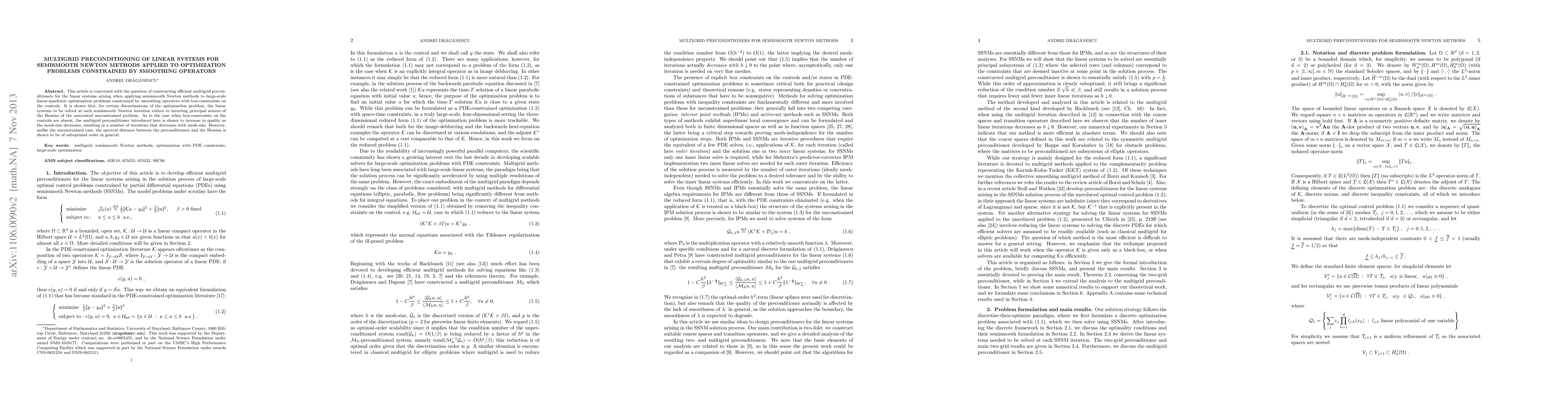 This paper develops efficient multigrid preconditioners for linear systems in semismooth Newton methods applied to optimization problems with smoothing constraints. The preconditioners improve convergence as mesh size decreases, though their spectral distance from the Hessian is suboptimal.