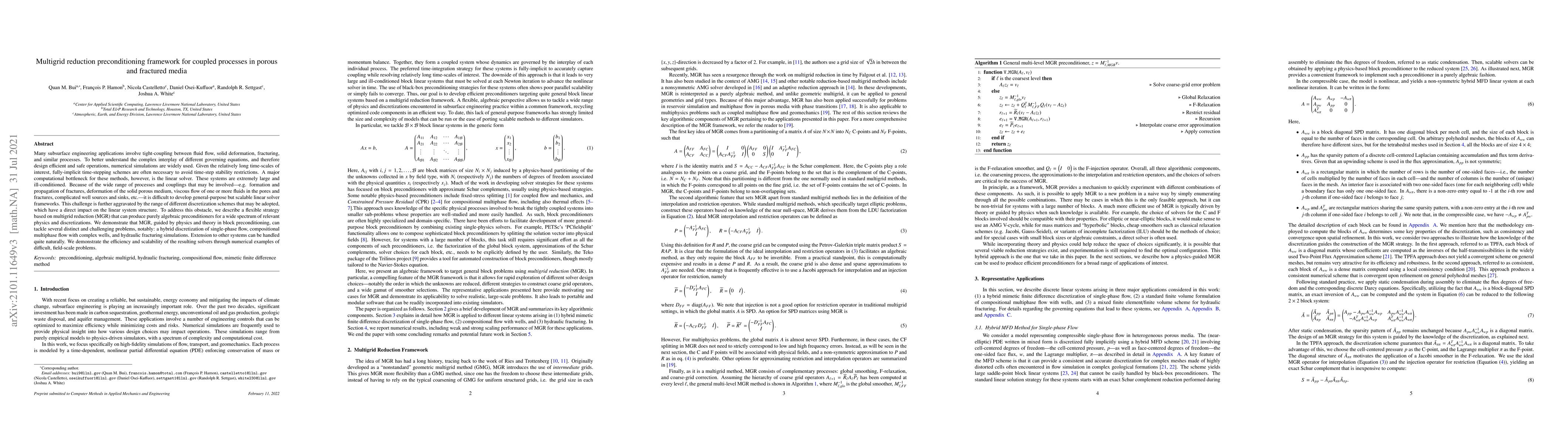 This paper presents a multigrid reduction preconditioning framework for efficiently solving large, ill-conditioned linear systems arising from coupled processes in porous and fractured media. The framework is demonstrated to be scalable and applicable to various problems, including single-phase flow, compositional multiphase flow, and hydraulic fracturing simulations.