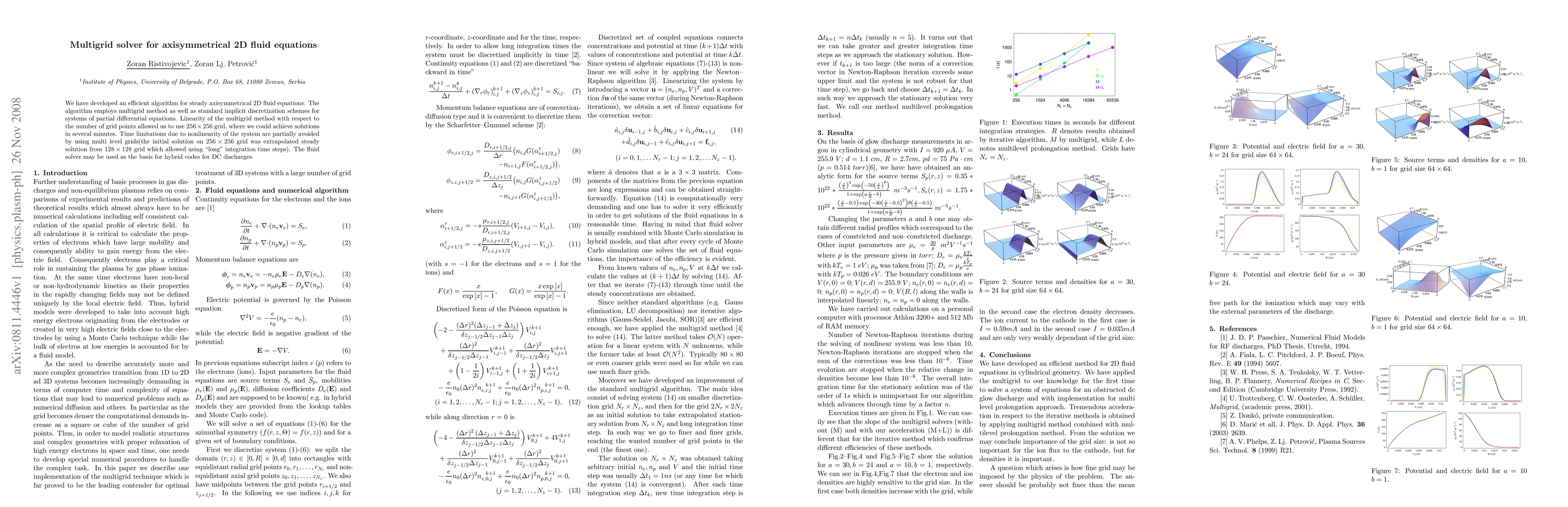 We have developed an efficient algorithm for steady axisymmetrical 2D fluid equations. The algorithm employs multigrid method as well as standard implicit discretization schemes for systems of partial differential equations. Linearity of the multigrid method with respect to the number of grid points allowed us to use $256\times 256$ grid, where we could achieve solutions in several minutes. Time limitations due to nonlinearity of the system are partially avoided by using multi level grids(the initial solution on $256\times 256$ grid was extrapolated steady solution from $128\times 128$ grid which allowed using "long" integration time steps). The fluid solver may be used as the basis for hybrid codes for DC discharges.