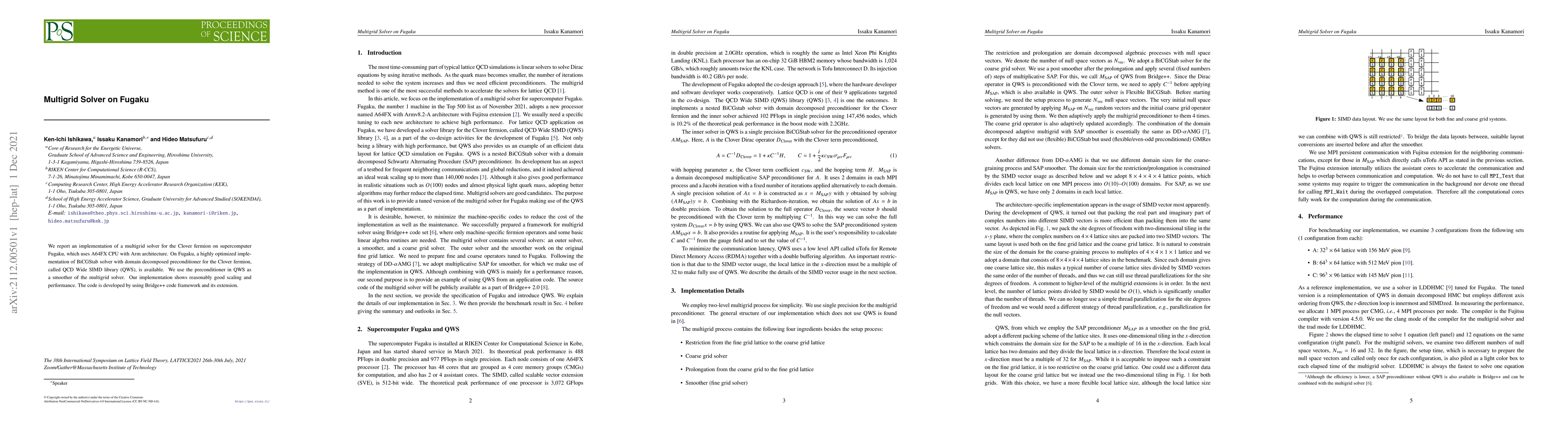 Summary: This paper details an implementation of a multigrid solver on Fugaku supercomputer using A64FX CPUs, focusing on the Clover fermion with a BiCGStab solver and domain decomposed preconditioner from the QCD Wide SIMD library, showing good scaling and performance within the Bridge++ framework.