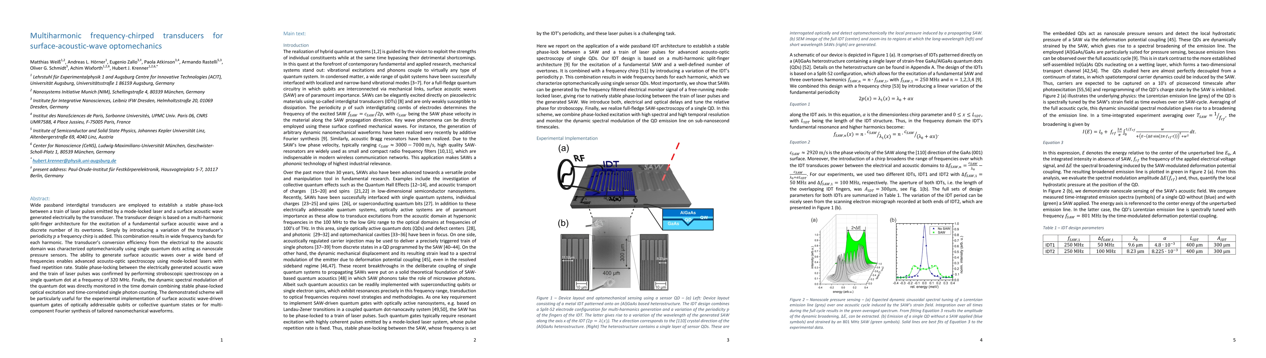 The paper presents a novel multiharmonic frequency-chirped transducer design for surface acoustic wave optomechanics, enabling wide frequency bands for SAW generation and stable phase-locking with mode-locked lasers.