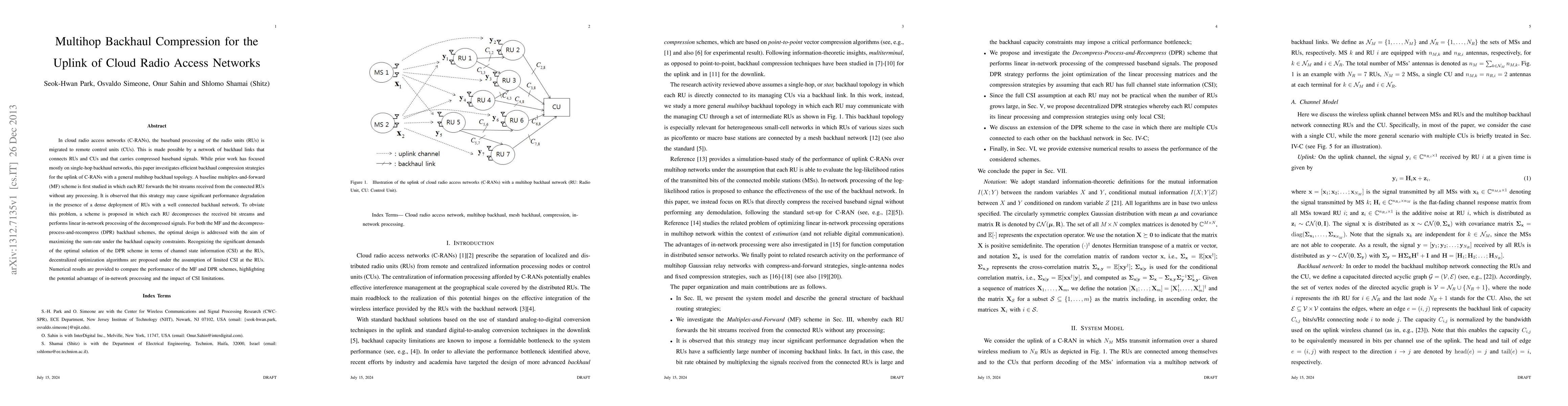 This paper investigates backhaul compression strategies for the uplink of cloud radio access networks (C-RANs) with multihop topologies. It compares a baseline multiplex-and-forward (MF) scheme with a decompress-process-and-recompress (DPR) scheme to maximize sum-rate under capacity constraints, highlighting the benefits of in-network processing despite challenges with limited channel state information (CSI).