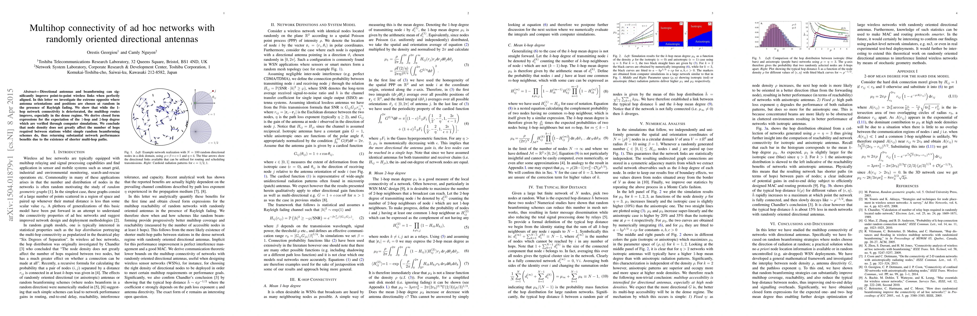 Randomly oriented directional antennas in ad hoc networks show improved multihop connectivity despite deteriorated 1-hop links, with node density having less impact on hop count than beamforming schemes.