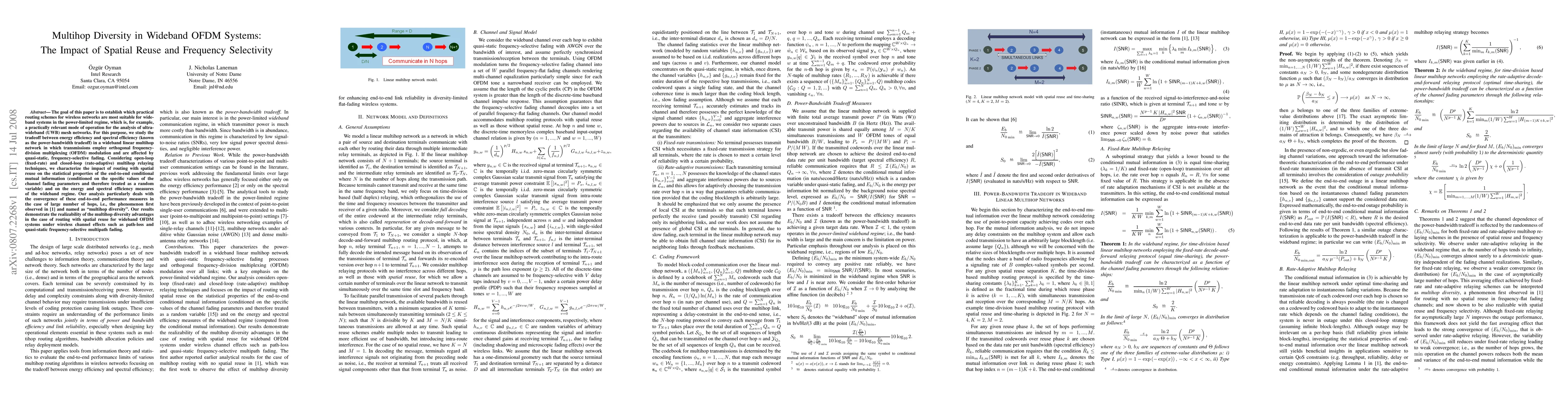 The goal of this paper is to establish which practical routing schemes for wireless networks are most suitable for wideband systems in the power-limited regime, which is, for example, a practically relevant mode of operation for the analysis of ultrawideband (UWB) mesh networks. For this purpose, we study the tradeoff between energy efficiency and spectral efficiency (known as the power-bandwidth tradeoff) in a wideband linear multihop network in which transmissions employ orthogonal frequency-division multiplexing (OFDM) modulation and are affected by quasi-static, frequency-selective fading. Considering open-loop (fixed-rate) and closed-loop (rate-adaptive) multihop relaying techniques, we characterize the impact of routing with spatial reuse on the statistical properties of the end-to-end conditional mutual information (conditioned on the specific values of the channel fading parameters and therefore treated as a random variable) and on the energy and spectral efficiency measures of the wideband regime. Our analysis particularly deals with the convergence of these end-to-end performance measures in the case of large number of hops, i.e., the phenomenon first observed in \cite{Oyman06b} and named as ``multihop diversity''. Our results demonstrate the realizability of the multihop diversity advantages in the case of routing with spatial reuse for wideband OFDM systems under wireless channel effects such as path-loss and quasi-static frequency-selective multipath fading.