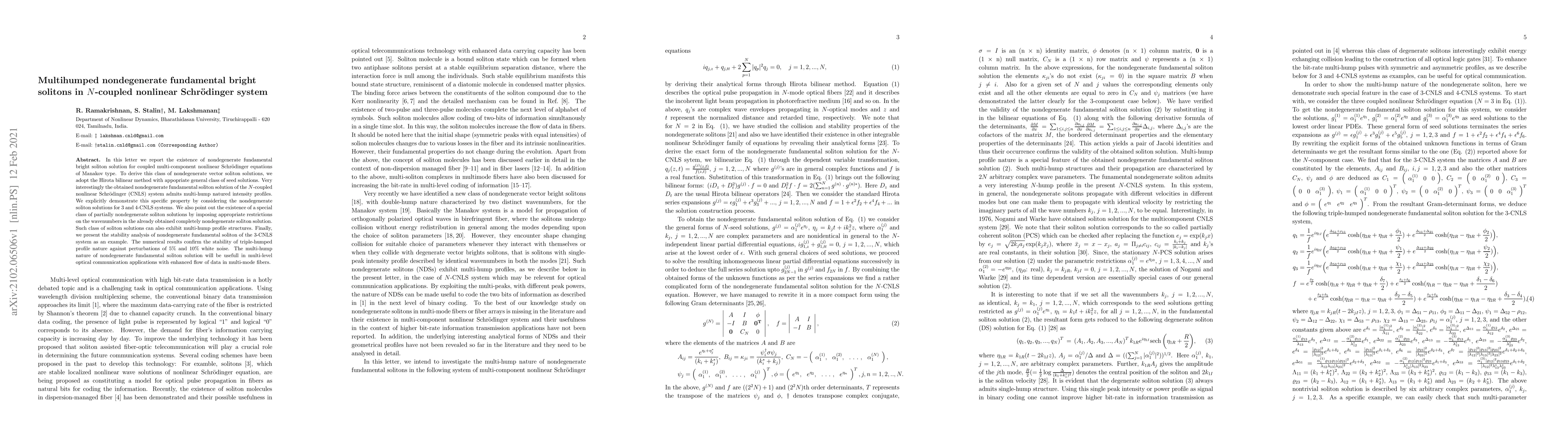 This paper reports the existence of nondegenerate fundamental bright soliton solutions in $N$-coupled nonlinear Schrödinger systems, derived using the Hirota bilinear method. The solutions exhibit multi-hump intensity profiles, confirmed through stability analysis for a triple-humped soliton in a 3-component system, which is promising for multi-level optical communication applications.