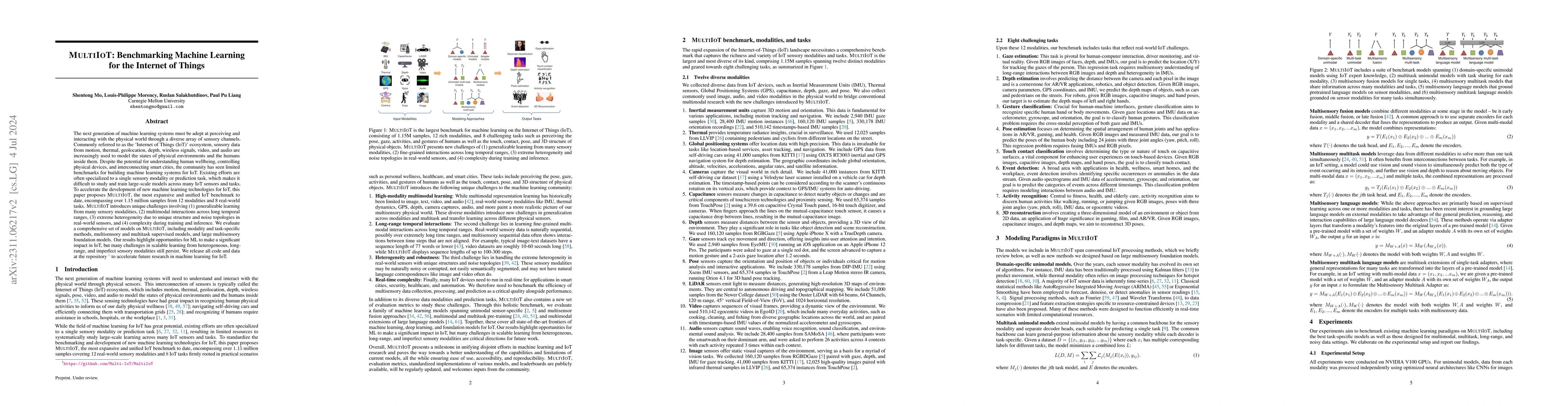 The Internet of Things (IoT), the network integrating billions of smart physical devices embedded with sensors, software, and communication technologies for the purpose of connecting and exchanging data with other devices and systems, is a critical and rapidly expanding component of our modern world. The IoT ecosystem provides a rich source of real-world modalities such as motion, thermal, geolocation, imaging, depth, sensors, video, and audio for prediction tasks involving the pose, gaze, activities, and gestures of humans as well as the touch, contact, pose, 3D of physical objects. Machine learning presents a rich opportunity to automatically process IoT data at scale, enabling efficient inference for impact in understanding human wellbeing, controlling physical devices, and interconnecting smart cities. To develop machine learning technologies for IoT, this paper proposes MultiIoT, the most expansive IoT benchmark to date, encompassing over 1.15 million samples from 12 modalities and 8 tasks. MultiIoT introduces unique challenges involving (1) learning from many sensory modalities, (2) fine-grained interactions across long temporal ranges, and (3) extreme heterogeneity due to unique structure and noise topologies in real-world sensors. We also release a set of strong modeling baselines, spanning modality and task-specific methods to multisensory and multitask models to encourage future research in multisensory representation learning for IoT.
