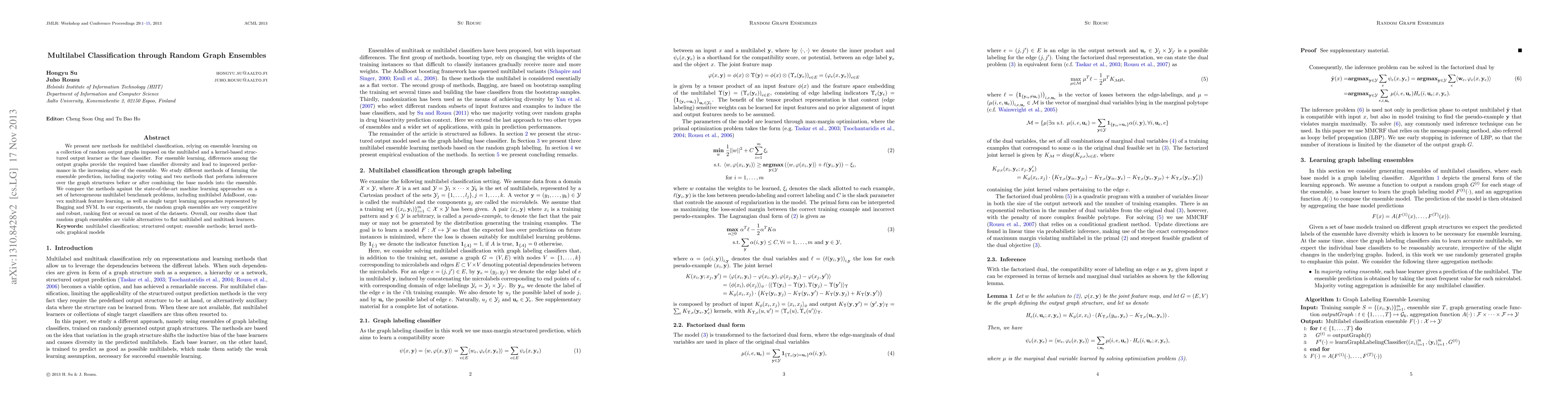 We present new methods for multilabel classification, relying on ensemble learning on a collection of random output graphs imposed on the multilabel and a kernel-based structured output learner as the base classifier. For ensemble learning, differences among the output graphs provide the required base classifier diversity and lead to improved performance in the increasing size of the ensemble. We study different methods of forming the ensemble prediction, including majority voting and two methods that perform inferences over the graph structures before or after combining the base models into the ensemble. We compare the methods against the state-of-the-art machine learning approaches on a set of heterogeneous multilabel benchmark problems, including multilabel AdaBoost, convex multitask feature learning, as well as single target learning approaches represented by Bagging and SVM. In our experiments, the random graph ensembles are very competitive and robust, ranking first or second on most of the datasets. Overall, our results show that random graph ensembles are viable alternatives to flat multilabel and multitask learners.