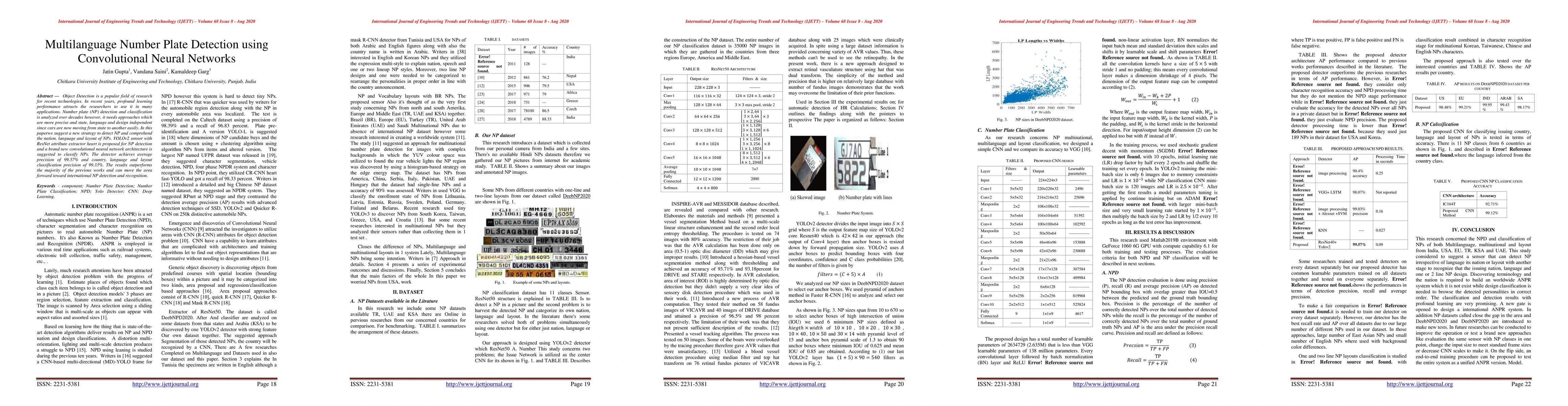 Object Detection is a popular field of research for recent technologies. In recent years, profound learning performance attracts the researchers to use it in many applications. Number plate (NP) detection and classification is analyzed over decades however, it needs approaches which are more precise and state, language and design independent since cars are now moving from state to another easily. In this paperwe suggest a new strategy to detect NP and comprehend the nation, language and layout of NPs. YOLOv2 sensor with ResNet attribute extractor heart is proposed for NP detection and a brand new convolutional neural network architecture is suggested to classify NPs. The detector achieves average precision of 99.57% and country, language and layout classification precision of 99.33%. The results outperforms the majority of the previous works and can move the area forward toward international NP detection and recognition.