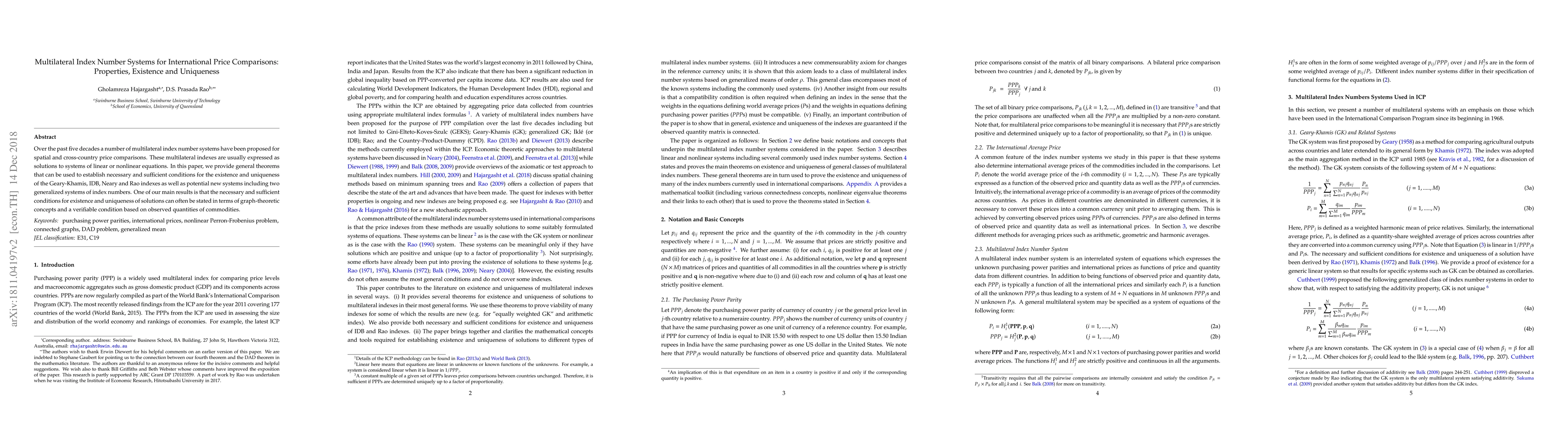 Over the past five decades a number of multilateral index number systems have been proposed for spatial and cross-country price comparisons. These multilateral indexes are usually expressed as solutions to systems of linear or nonlinear equations. In this paper, we provide general theorems that can be used to establish necessary and sufficient conditions for the existence and uniqueness of the Geary-Khamis, IDB, Neary and Rao indexes as well as potential new systems including two generalized systems of index numbers. One of our main results is that the necessary and sufficient conditions for existence and uniqueness of solutions can often be stated in terms of graph-theoretic concepts and a verifiable condition based on observed quantities of commodities.