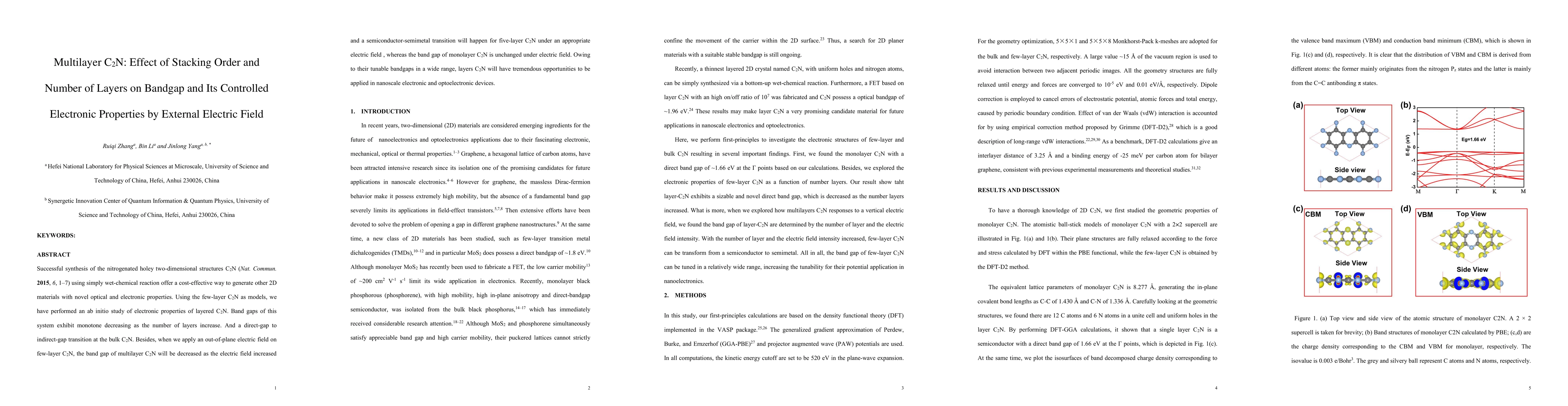 Successful synthesis of the nitrogenated holey two-dimensional structures C2N (Nat. Commun. 2015, 6, 1-7) using simply wet-chemical reaction offer a cost-effective way to generate other 2D materials with novel optical and electronic properties. Using the few-layer C2N as models, we have performed an ab initio study of electronic properties of layered C2N. Band gaps of this system exhibit monotone decreasing as the number of layers increase. And a direct-gap to indirect-gap transition at the bulk C2N. Besides, when we apply an out-of-plane electric field on few-layer C2N, the band gap of multilayer C2N will be decreased as the electric field increased and a semiconductor-semimetal transition will happen for five-layer C2N under an appropriate electric field, whereas the band gap of monolayer C2N is unchanged under electric field. Owing to their tunable bandgaps in a wide range, layers C2N will have tremendous opportunities to be applied in nanoscale electronic and optoelectronic devices.