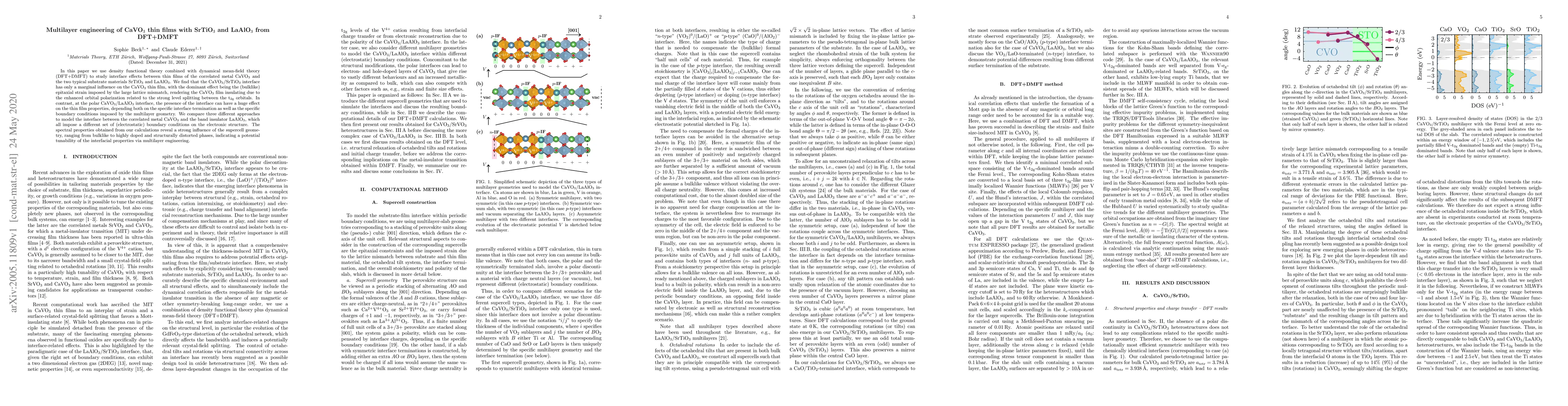 In this paper we use density functional theory combined with dynamical mean-field theory (DFT+DMFT) to study interface effects between thin films of the correlated metal CaVO$_3$ and the two typical substrate materials SrTiO$_3$ and LaAlO$_3$. We find that the CaVO$_3$/SrTiO$_3$ interface has only a marginal influence on the CaVO$_3$ thin film, with the dominant effect being the (bulklike) epitaxial strain imposed by the large lattice mismatch, rendering the CaVO$_3$ film insulating due to the enhanced orbital polarization related to the strong level splitting between the t$_{\mathrm{2g}}$ orbitals. In contrast, at the polar CaVO$_3$/LaAlO$_3$ interface, the presence of the interface can have a huge effect on the thin film properties, depending both on the specific interface termination as well as the specific boundary conditions imposed by the multilayer geometry. We compare three different approaches to model the interface between the correlated metal CaVO$_3$ and the band insulator LaAlO$_3$, which all impose a different set of (electrostatic) boundary conditions on the electronic structure. The spectral properties obtained from our calculations reveal a strong influence of the supercell geometry, ranging from bulklike to highly doped and structurally distorted phases, indicating a potential tunability of the interfacial properties via multilayer engineering.
