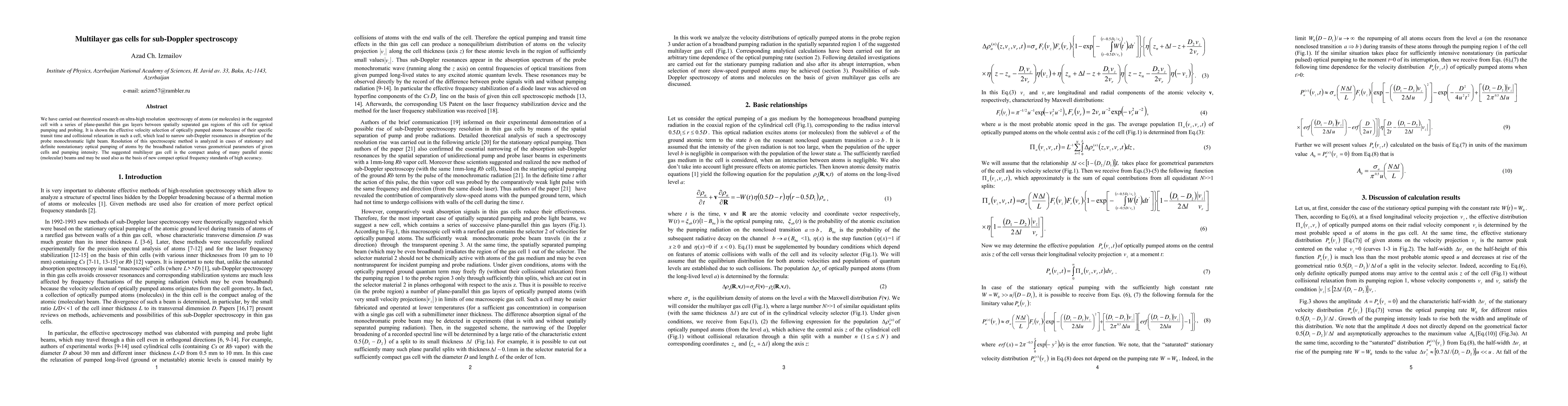 We have carried out theoretical research on ultra-high resolution spectroscopy of atoms (or molecules) in the suggested cell with a series of plane-parallel thin gas layers between spatially separated gas regions of this cell for optical pumping and probing. It is shown the effective velocity selection of optically pumped atoms because of their specific transit time and collisional relaxation in such a cell, which lead to narrow sub-Doppler resonances in absorption of the probe monochromatic light beam. Resolution of this spectroscopic method is analyzed in cases of stationary and definite nonstationary optical pumping of atoms by the broadband radiation versus geometrical parameters of given cells and pumping intensity. The suggested multilayer gas cell is the compact analog of many parallel atomic (molecular) beams and may be used also as the basis of new compact optical frequency standards of high accuracy.