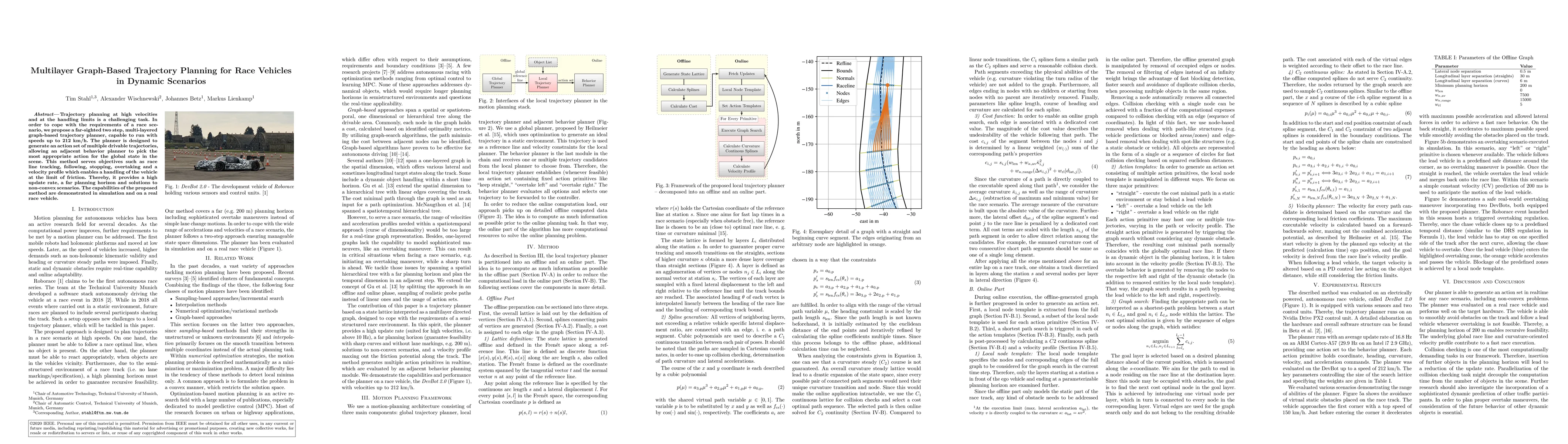 This paper proposes a multi-layered graph-based trajectory planner for race vehicles operating at high speeds and handling limits. The planner generates drivable trajectories for various maneuvers, enabling real-time decision-making and optimal performance in dynamic scenarios, validated through simulations and real-world testing.