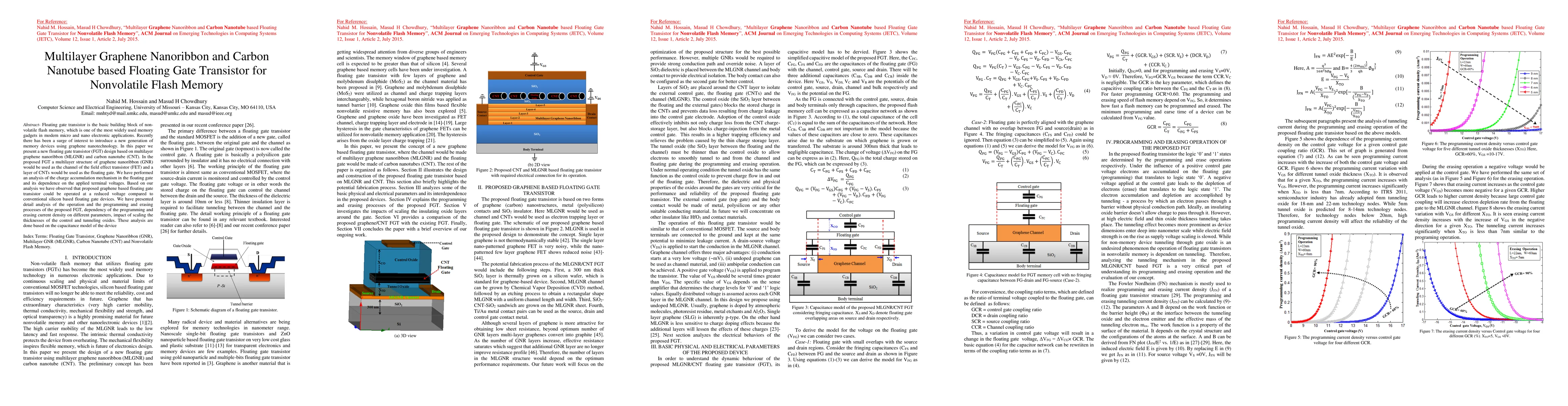 This paper proposes a novel floating gate transistor (FGT) for non-volatile flash memory using multilayer graphene nanoribbon (MLGNR) and carbon nanotube (CNT) layers, demonstrating lower operation voltages and efficient charge accumulation mechanisms compared to silicon-based devices. The analysis includes the programming and erasing processes, current density dependencies, and oxide scaling effects.