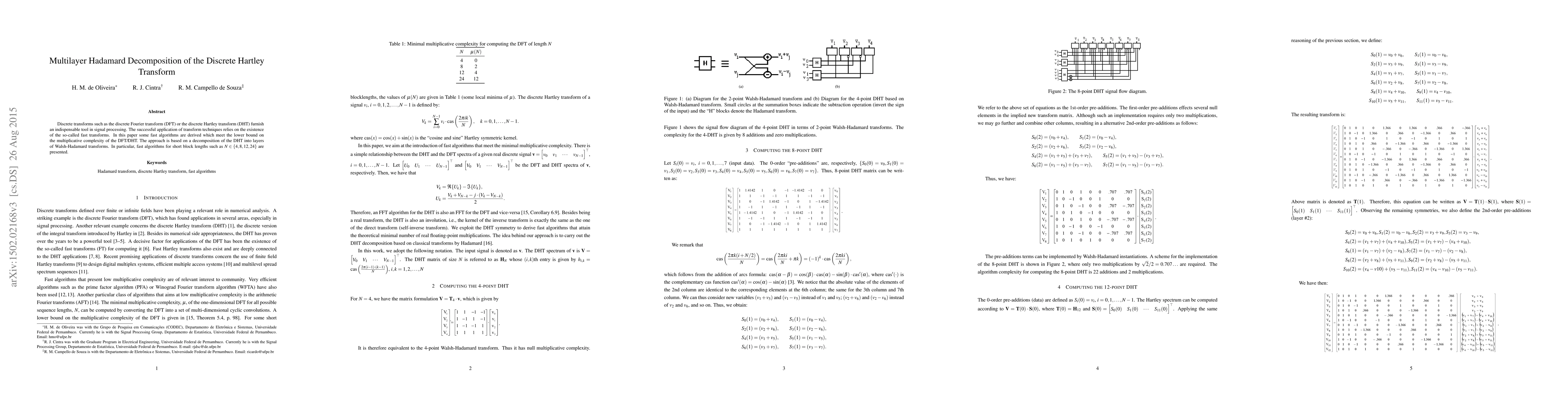 The paper presents fast algorithms for Discrete Hartley Transform (DHT) based on multilayer decomposition using Walsh-Hadamard transforms, focusing on short block lengths such as 4, 8, 12, and 24.