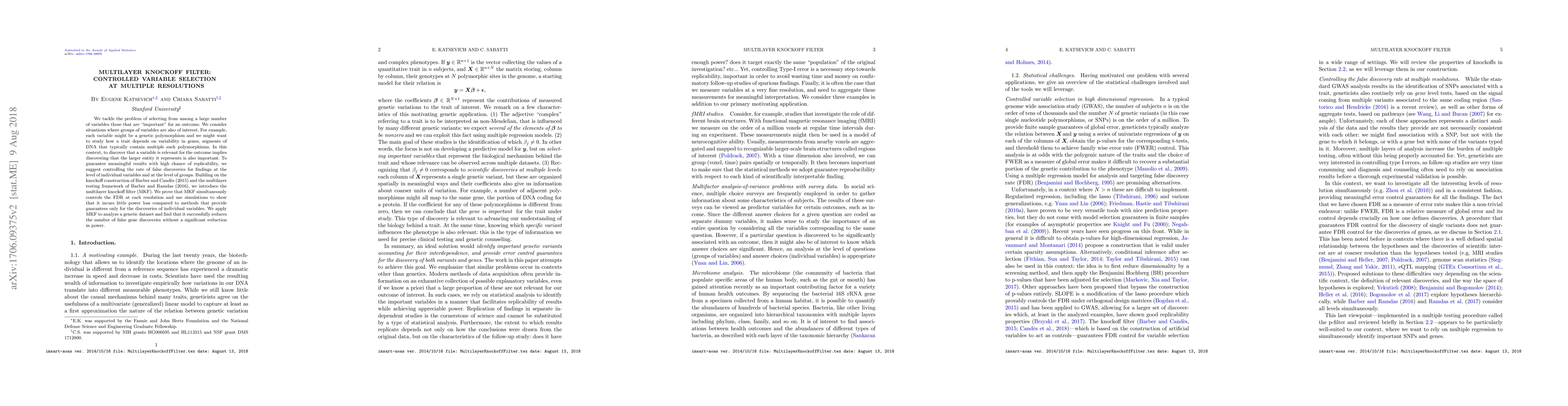 We tackle the problem of selecting from among a large number of variables those that are 'important' for an outcome. We consider situations where groups of variables are also of interest in their own right. For example, each variable might be a genetic polymorphism and we might want to study how a trait depends on variability in genes, segments of DNA that typically contain multiple such polymorphisms. Or, variables might quantify various aspects of the functioning of individual internet servers owned by a company, and we might be interested in assessing the importance of each server as a whole on the average download speed for the company's customers. In this context, to discover that a variable is relevant for the outcome implies discovering that the larger entity it represents is also important. To guarantee meaningful and reproducible results, we suggest controlling the rate of false discoveries for findings at the level of individual variables and at the level of groups. Building on the knockoff construction of Barber and Candes (2015) and the multilayer testing framework of Barber and Ramdas (2016), we introduce the multilayer knockoff filter (MKF). We prove that MKF simultaneously controls the FDR at each resolution and use simulations to show that it incurs little power loss compared to methods that provide guarantees only for the discoveries of individual variables. We apply MKF to analyze a genetic dataset and find that it successfully reduces the number of false gene discoveries without a significant reduction in power.