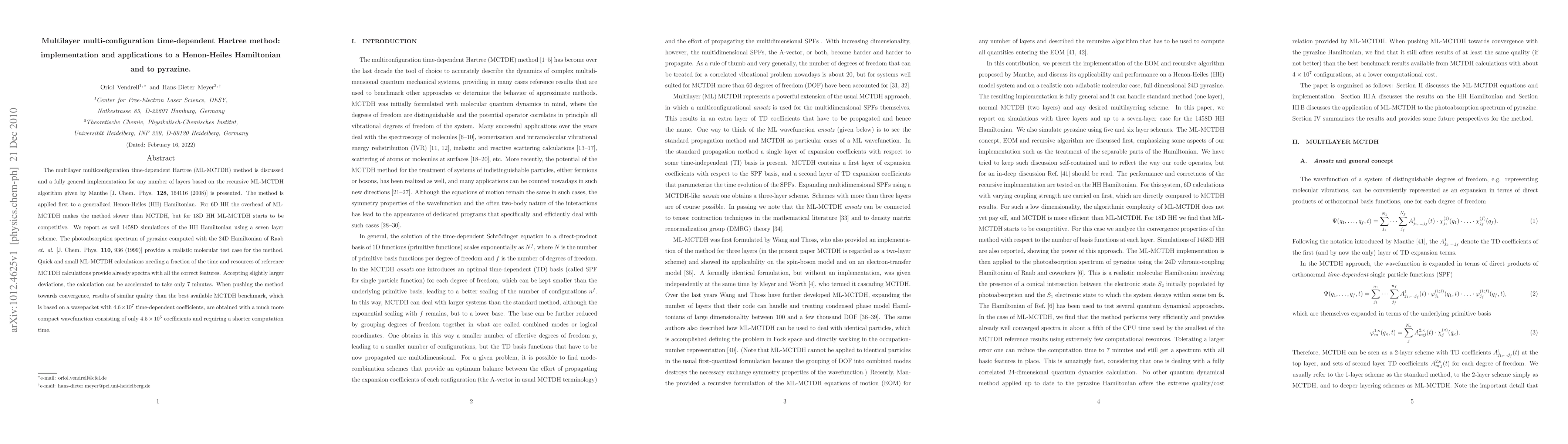The multilayer multiconfiguration time-dependent Hartree (ML-MCTDH) method is implemented for various dimensions and applied to the Henon-Heiles Hamiltonian and pyrazine. While ML-MCTDH is slower than MCTDH for lower dimensions, it becomes competitive for higher dimensions and provides accurate photoabsorption spectra with reduced computational time and resources.