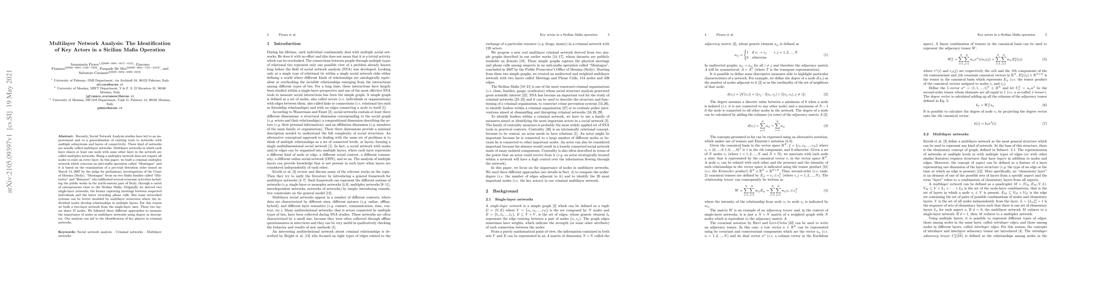 This paper constructs a criminal multiplex network from an anti-mafia operation in Sicily, analyzing relationships from meetings and phone calls to identify key actors within the Mistretta and Batanesi Mafia families. It employs multilayer network analysis to better model complex criminal interactions, ultimately aiding in pinpointing influential figures.