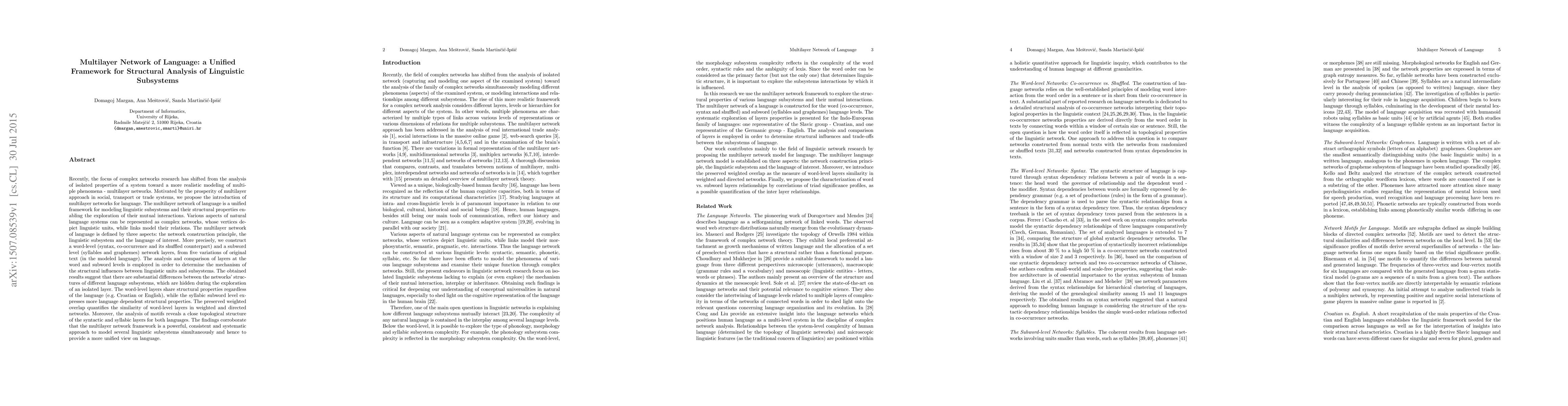 This paper proposes a multilayer network framework for analyzing linguistic subsystems, revealing substantial differences in structural properties between word-level and subword-level networks. The study finds that word-level layers share structural similarities across languages, while subword-level layers exhibit more language-specific properties, highlighting the framework's effectiveness in providing a unified view of language.
