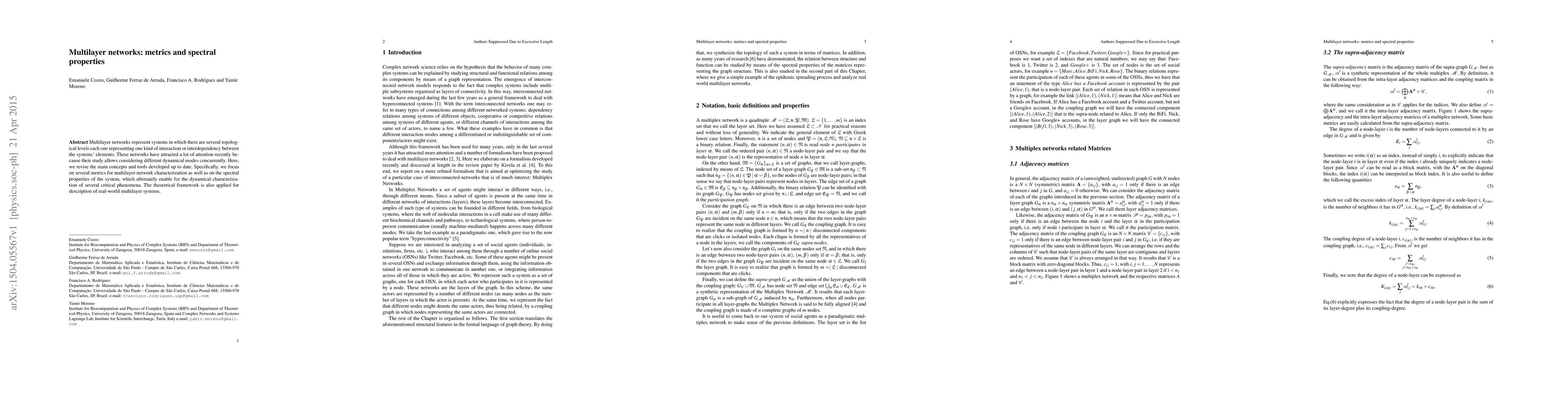 Multilayer networks represent systems in which there are several topological levels each one representing one kind of interaction or interdependency between the systems' elements. These networks have attracted a lot of attention recently because their study allows considering different dynamical modes concurrently. Here, we revise the main concepts and tools developed up to date. Specifically, we focus on several metrics for multilayer network characterization as well as on the spectral properties of the system, which ultimately enable for the dynamical characterization of several critical phenomena. The theoretical framework is also applied for description of real-world multilayer systems.