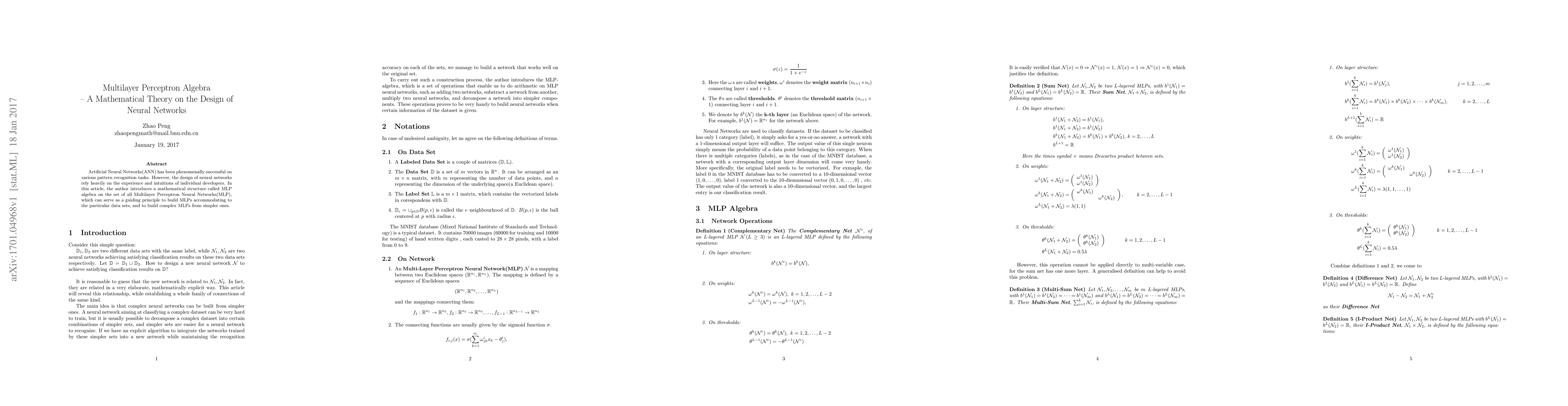 The paper introduces MLP algebra, a mathematical structure on the set of all Multilayer Perceptron Neural Networks (MLPs), which provides a guiding principle to build MLPs tailored to specific datasets and to construct complex MLPs from simpler ones.