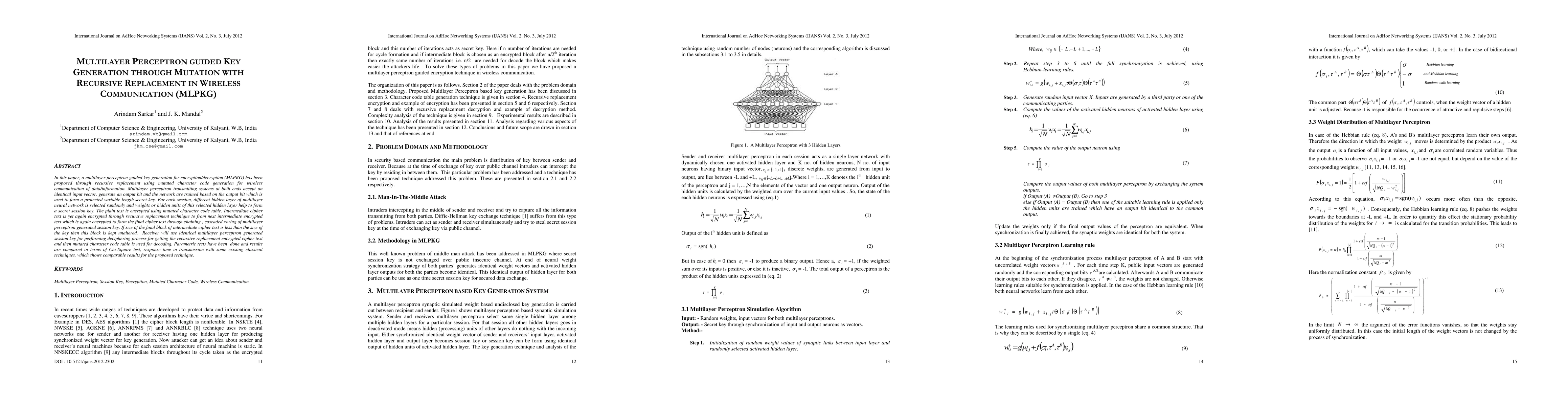 This paper proposes a multilayer perceptron guided key generation (MLPKG) method for secure wireless communication using recursive replacement and mutated character codes. The method employs neural networks to create session keys and encrypts data through multiple layers of encryption, showing comparable results to classical techniques in parametric tests.