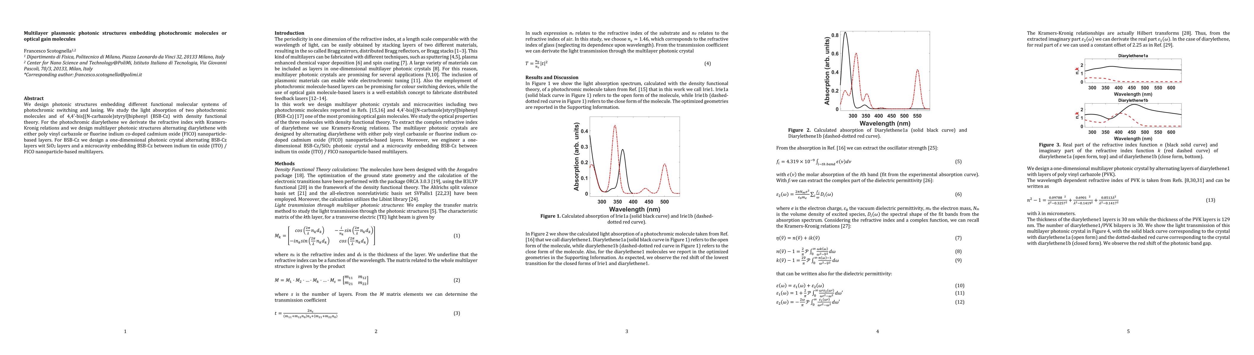 This research designs photonic structures incorporating photochromic and lasing molecules, analyzing their light absorption via density functional theory. It explores multilayer configurations alternating between diarylethene and functional layers, as well as BSB-Cz with $SiO_{2}$ and microcavity systems.