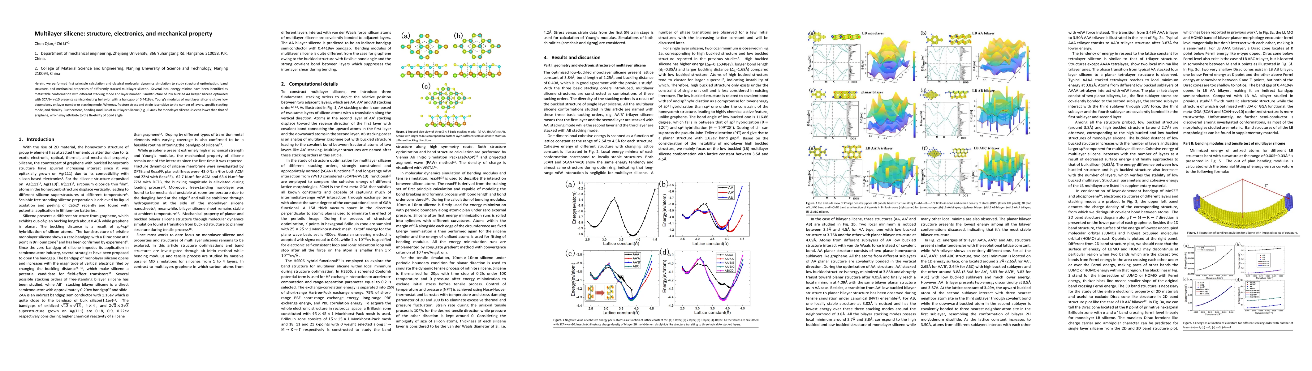 The paper presents a comprehensive study on the structural optimization, band structure, and mechanical properties of multilayer silicene using advanced computational methods, identifying key trends in its behavior as a function of layer number and stacking mode.
