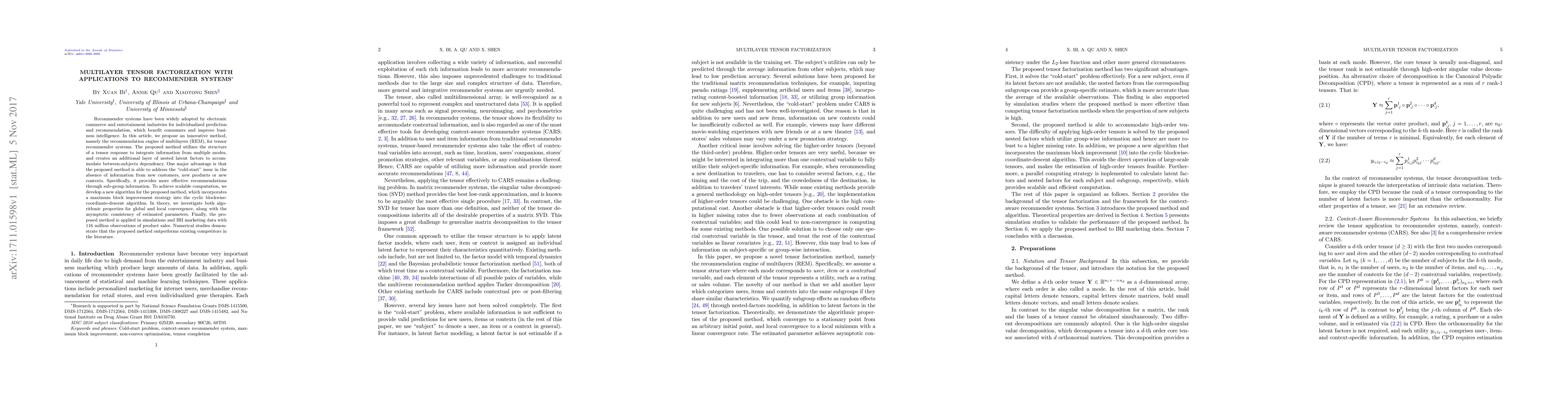 Recommender systems have been widely adopted by electronic commerce and entertainment industries for individualized prediction and recommendation, which benefit consumers and improve business intelligence. In this article, we propose an innovative method, namely the recommendation engine of multilayers (REM), for tensor recommender systems. The proposed method utilizes the structure of a tensor response to integrate information from multiple modes, and creates an additional layer of nested latent factors to accommodate between-subjects dependency. One major advantage is that the proposed method is able to address the "cold-start" issue in the absence of information from new customers, new products or new contexts. Specifically, it provides more effective recommendations through sub-group information. To achieve scalable computation, we develop a new algorithm for the proposed method, which incorporates a maximum block improvement strategy into the cyclic blockwise-coordinate-descent algorithm. In theory, we investigate both algorithmic properties for global and local convergence, along with the asymptotic consistency of estimated parameters. Finally, the proposed method is applied in simulations and IRI marketing data with 116 million observations of product sales. Numerical studies demonstrate that the proposed method outperforms existing competitors in the literature.