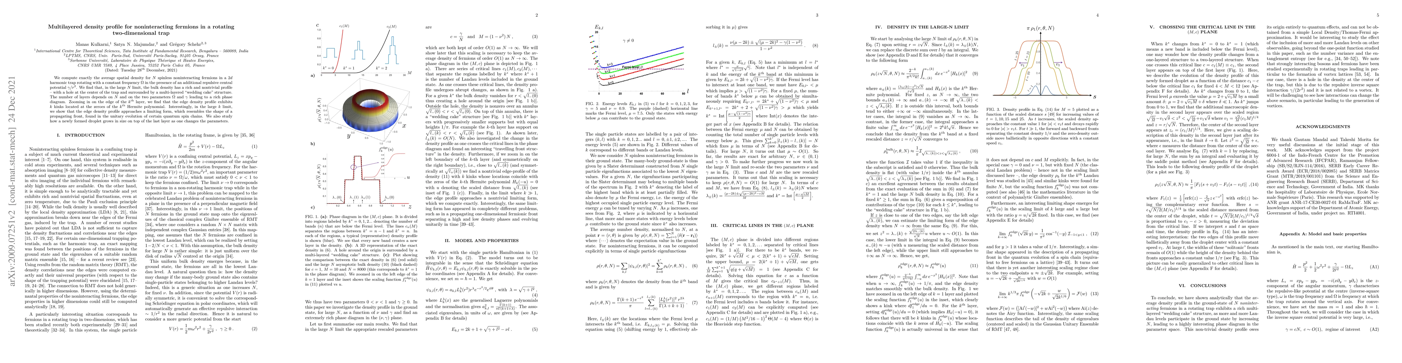 We compute exactly the average spatial density for $N$ spinless noninteracting fermions in a $2d$ harmonic trap rotating with a constant frequency $\Omega$ in the presence of an additional repulsive central potential $\gamma/r^2$. We find that, in the large $N$ limit, the bulk density has a rich and nontrivial profile -- with a hole at the center of the trap and surrounded by a multi-layered "wedding cake" structure. The number of layers depends on $N$ and on the two parameters $\Omega$ and $\gamma$ leading to a rich phase diagram. Zooming in on the edge of the $k^{\rm th}$ layer, we find that the edge density profile exhibits $k$ kinks located at the zeroes of the $k^{\rm th}$ Hermite polynomial. Interestingly, in the large $k$ limit, we show that the edge density profile approaches a limiting form, which resembles the shape of a propagating front, found in the unitary evolution of certain quantum spin chains. We also study how a newly formed droplet grows in size on top of the last layer as one changes the parameters.