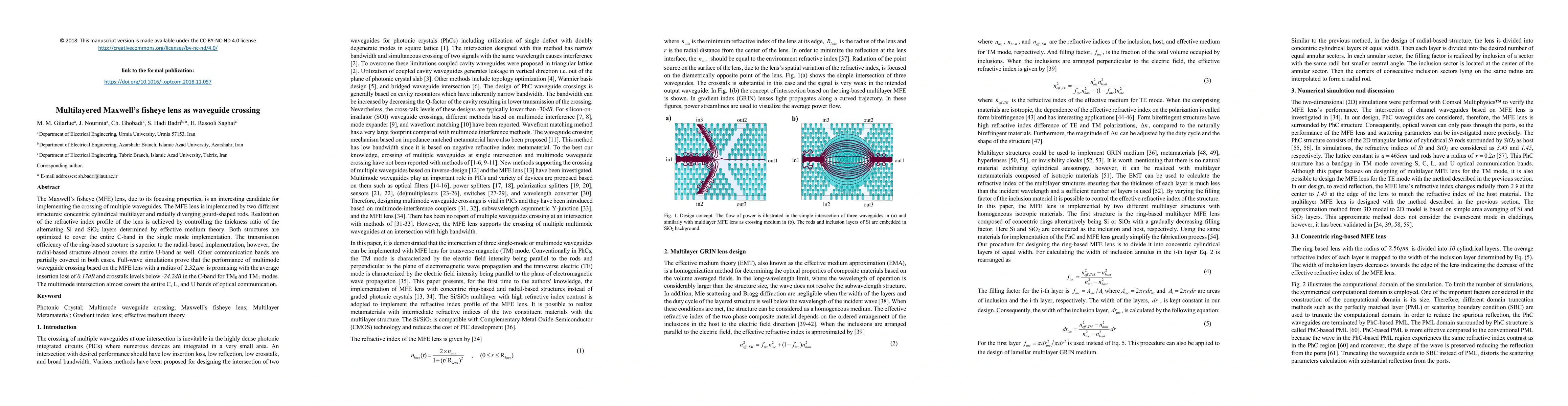 This paper explores the use of Maxwell's fisheye lenses for crossing multiple waveguides, with two structural implementations: concentric cylindrical multilayers and radially diverging gourd-shaped rods. Both structures achieve high transmission efficiency in the C-band, with the multilayer design showing superior performance.