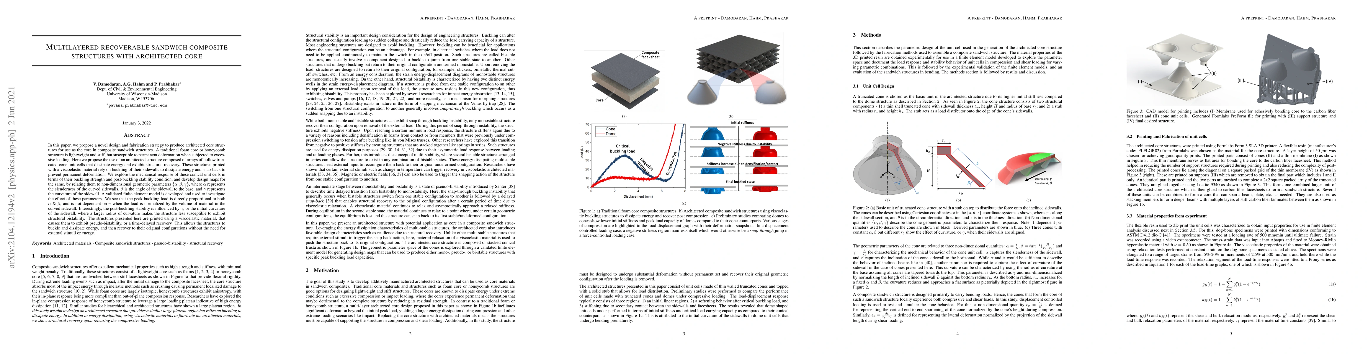 In this paper, we propose a novel design and fabrication strategy to produce architected core structures for use as the core in composite sandwich structures. A traditional foam core or honeycomb structure is lightweight and stiff, but susceptible to permanent deformation when subjected to excessive loading. Here we propose the use of an architected structure composed of arrays of hollow truncated cone unit cells that dissipate energy and exhibit structural recovery. These structures printed with a viscoelastic material rely on buckling of their sidewalls to dissipate energy and snap-back to prevent permanent deformation. We explore the mechanical response of these conical unit cells in terms of their buckling strength and post-buckling stability condition, and develop design maps for the same, by relating them to non-dimensional geometric parameters $\alpha$, $\beta$, $\gamma$, where $\alpha$ represents the slenderness of the curved sidewalls, $\beta$ is the angle of the sidewall to the base, and $\gamma$ represents the curvature of the sidewall. A validated finite element model is developed and used to investigate the effect of these parameters. We see that the peak buckling load is directly proportional to both $\alpha$ & $\beta$ and is not dependent on $\gamma$ when the load is normalized by the volume of material in the curved sidewall. Interestingly, the post-buckling stability is influenced by $\gamma$, or the initial curvature of the sidewall, where a larger radius of curvature makes the structure less susceptible to exhibit structural bistability. The structures presented here are printed using a viscoelastic material, that causes them to exhibit pseudo-bistability, or a time-delayed recovery. This allows the structures to buckle and dissipate energy, and then recover to their original configurations without the need for external stimuli or energy.